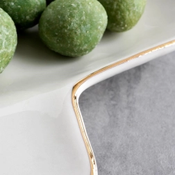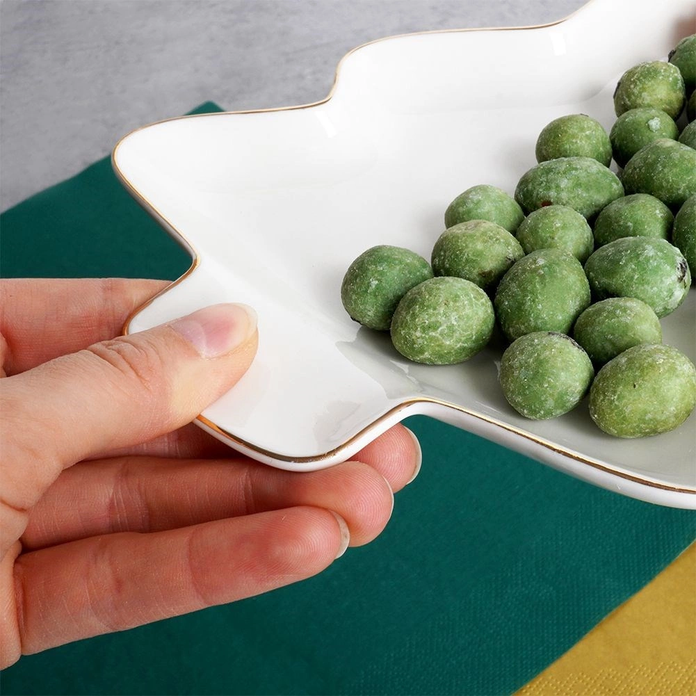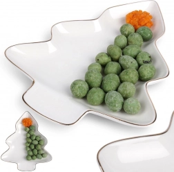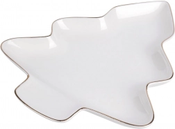 Elegantný porcelánový tanier v tvare stromčeka s rozmermi 20 × 16,5 × 2 cm dodá vášmu stolu sviatočné čaro. V bielej farbe so zlatým lemom pôsobí štýlovo a efektne, je pevný a odolný, vhodný na cukrovinky, pochutiny aj dezerty a môžete ho umývať v umývačke.