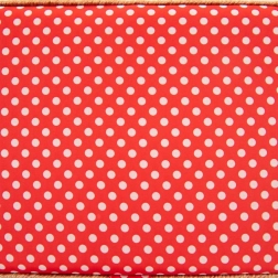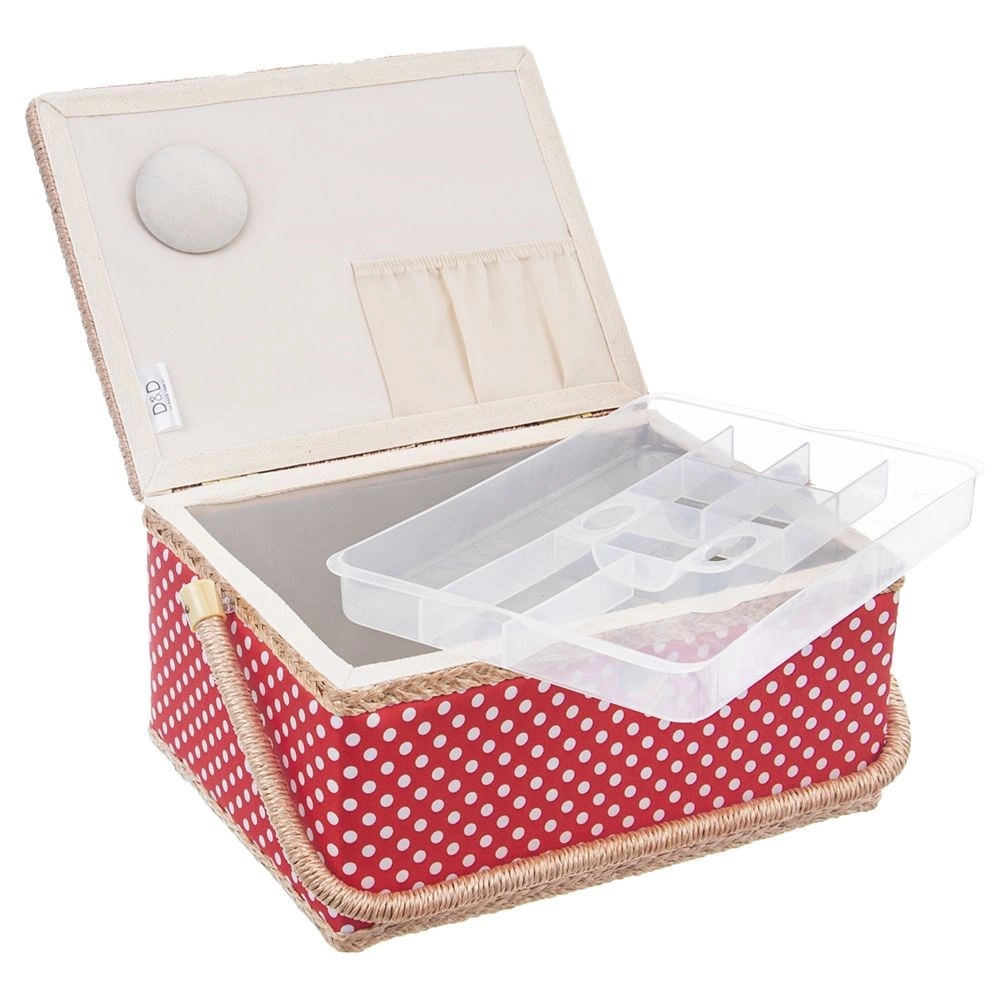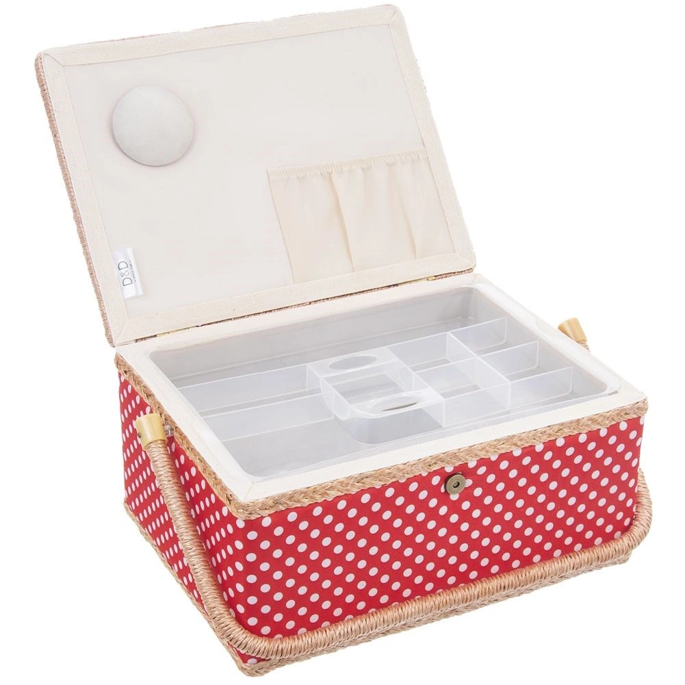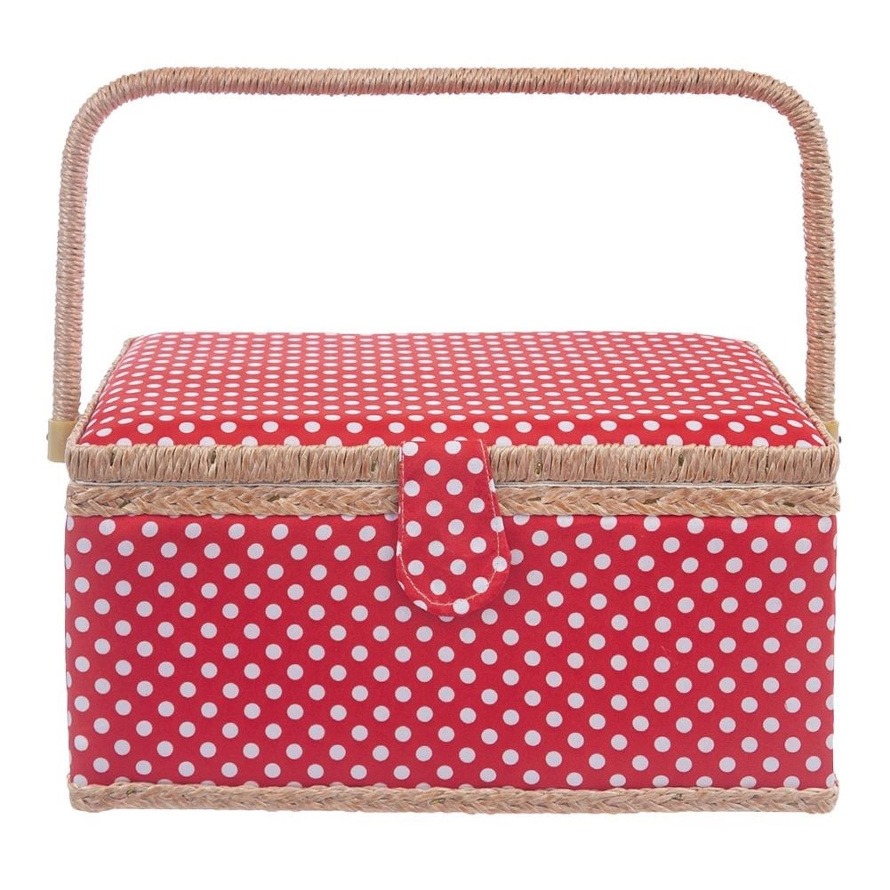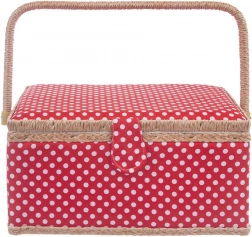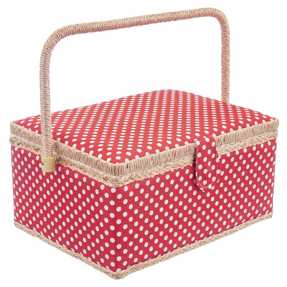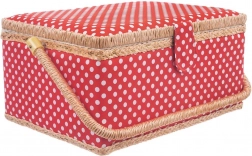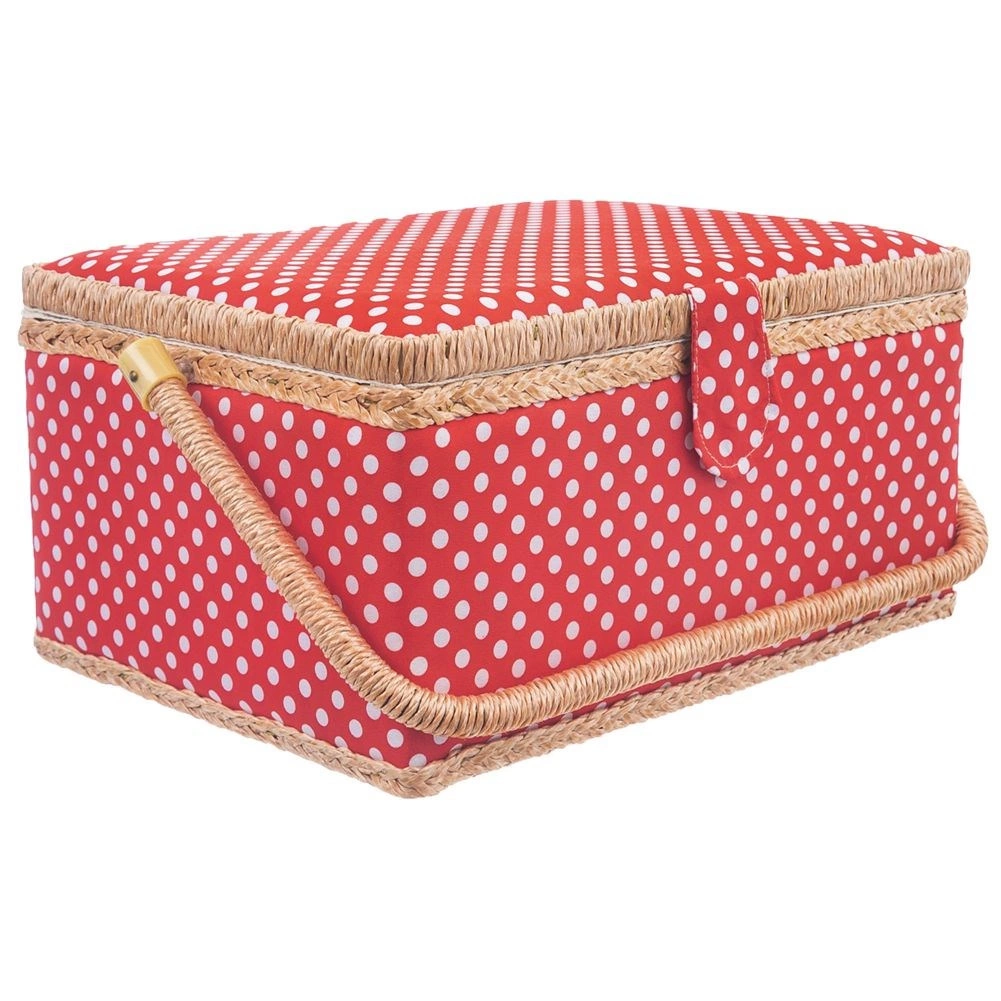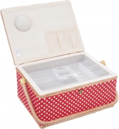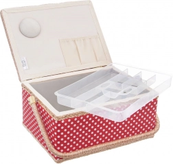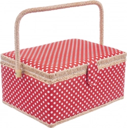 Tento šijací košík kombinuje atraktívny dizajn a premyslenú organizáciu. Telo košíka je potiahnuté látkou v červenej farbe s bielymi bodkami a doplnené pevnou rukoväťou pre jednoduché prenášanie. Vďaka magnetickému zapínaniu košík bezpečne uzavriete jedným pohybom a obsah zostane na svojom mieste aj pri prenášaní.
