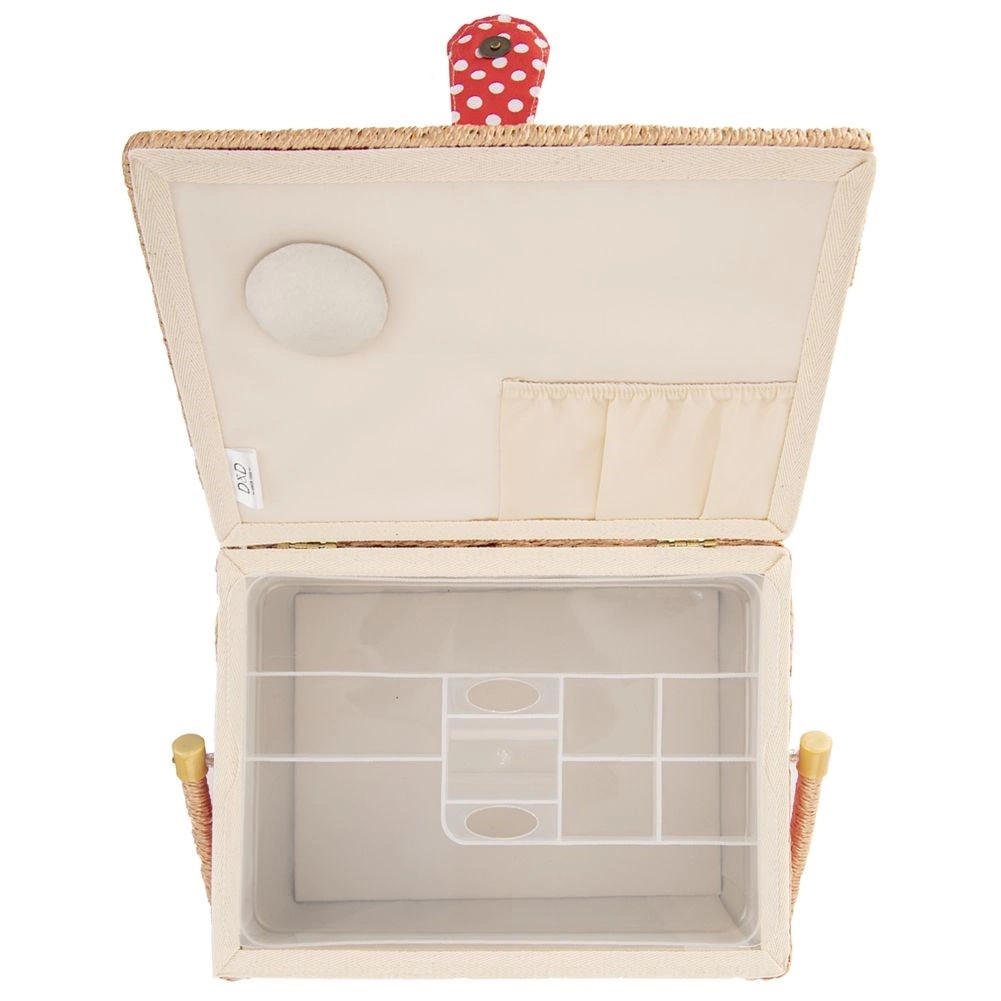 Vo vnútri nájdete vyberateľný plastový organizér so 4 priehradkami na nite, ihly, navliekače či gombíky. Po jeho vybratí získate priestrannú komoru pre väčšie krajčírske pomôcky. Vnútorná strana veka je vybavená elastickým vreckom a ihleničkom, kam pohodlne zapichnete špendlíky a ihly. Košík sa skvele hodí aj ako organizér na bižutériu.