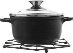 Vyrobená z kvalitného kovu v čiernej farbe, je pevná a odolná na každodenné používanie. Vďaka univerzálnemu rozmeru 22,5 × 22,5 cm je vhodná pre väčšinu hrncov a panvíc. Podložka je nielen praktická, ale aj dekoratívna, takže ju môžete nechať pokojne na stole ako dizajnový doplnok.