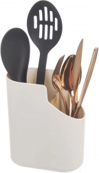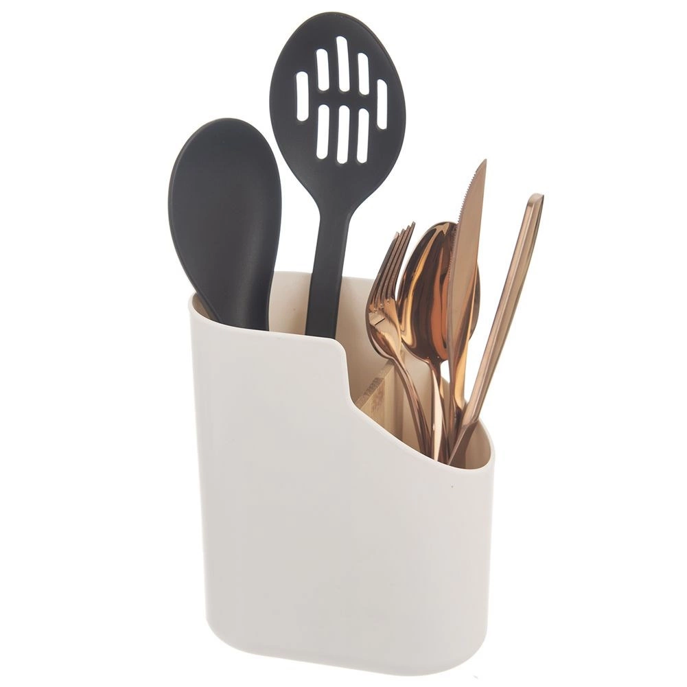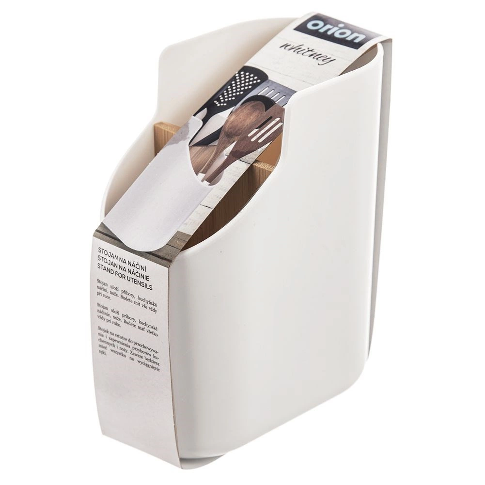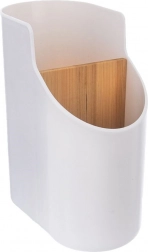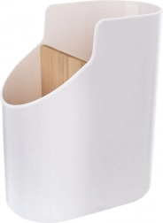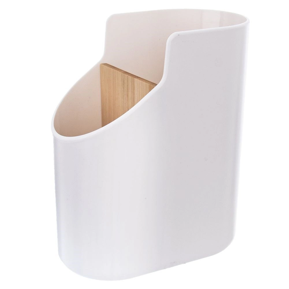 Praktický organizér na kuchynské náradie a príbory s elegantným bielym telom a bambusovou vyberateľnou priečkou. Vďaka dvojitej priehradke, perforovanému dnu a protišmykovej silikónovej základni udrží nástroje prehľadne a v suchu. Ľahký, odolný a ľahko sa čistí – ideálny doplnok do každej kuchyne.