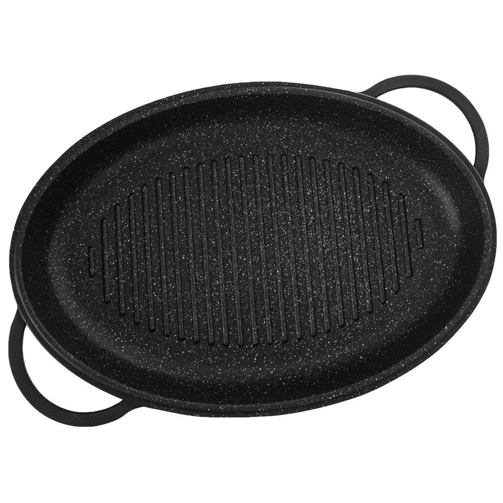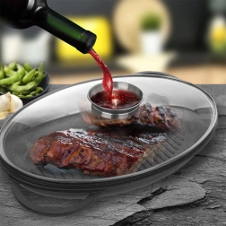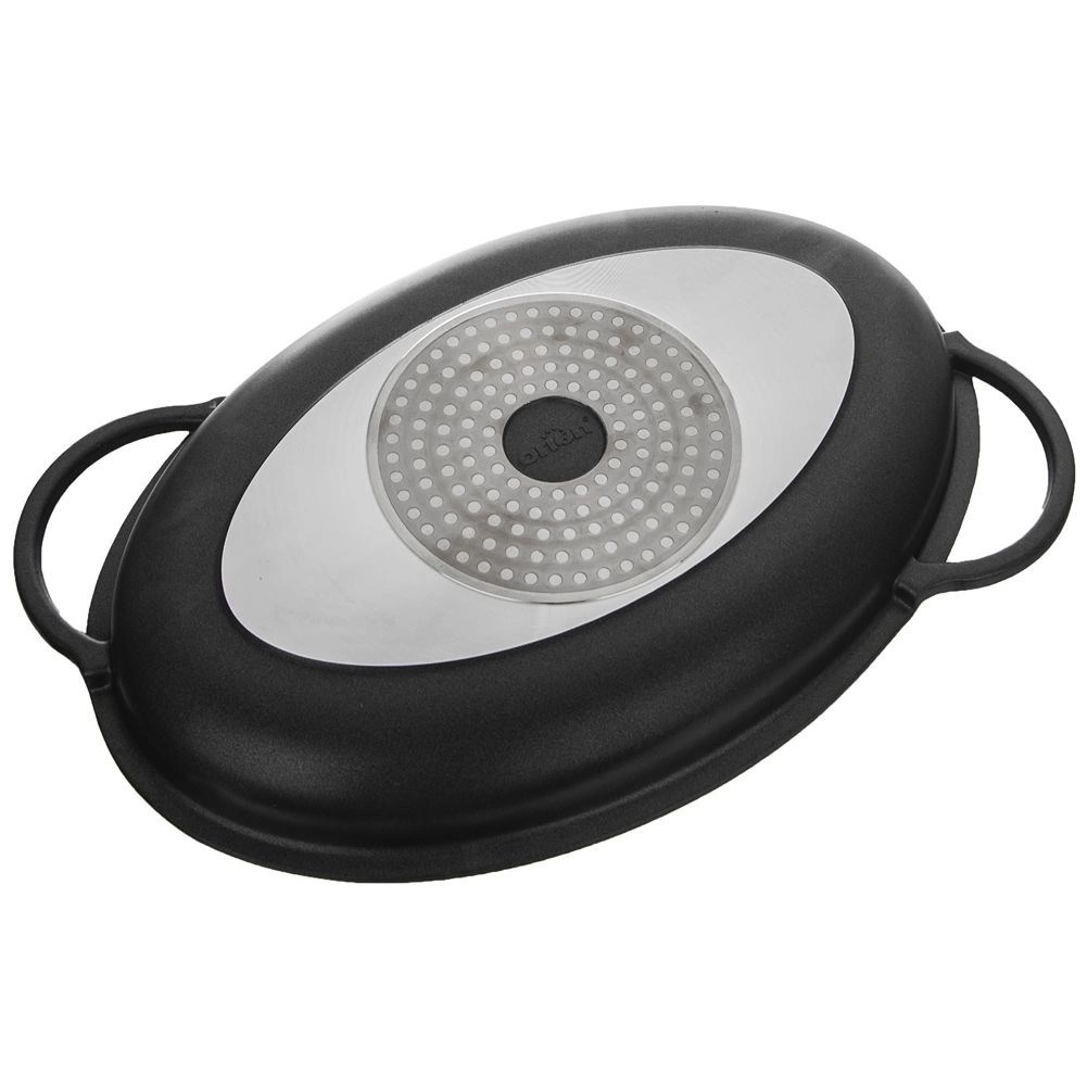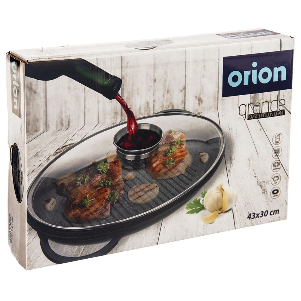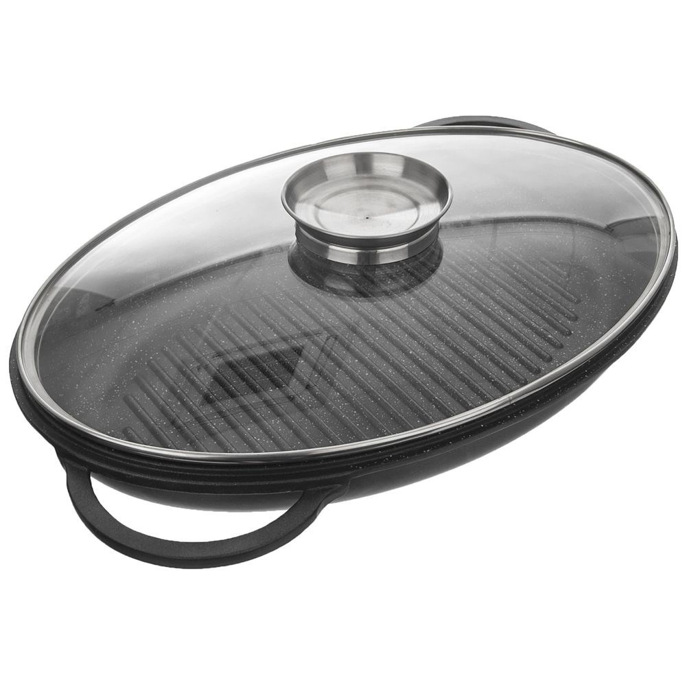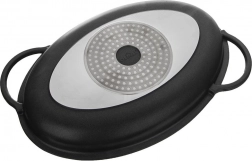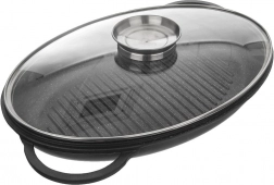Objavte univerzálnu grilovaciu panvicu, ktorá spája funkciu panvice aj pekáča. Oválny tvar so zvýšenými rebrami zaistí efektnú mriežku a odvod prebytočného tuku, sklenená pokrievka s integrovaným dávkovačom umožní prilievať víno či vývar bez zdvíhania veka. Ideálna na mäso, ryby aj zeleninu, na restovanie, dusenie aj pečenie.