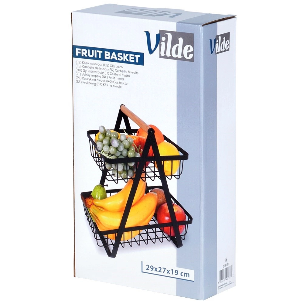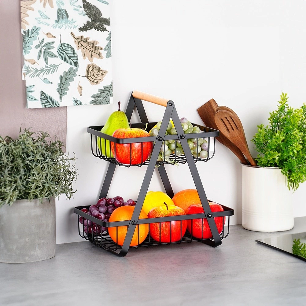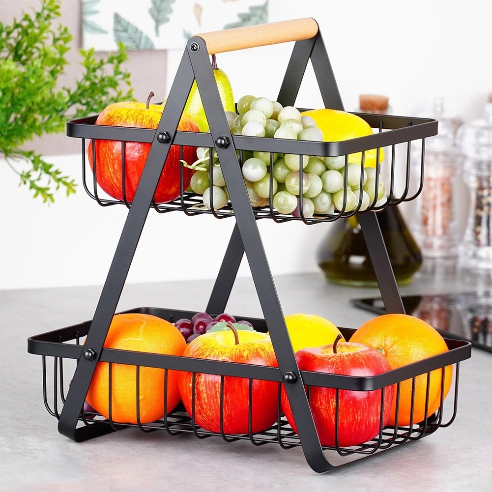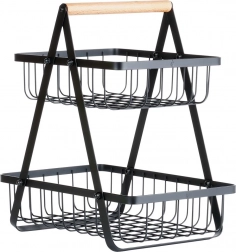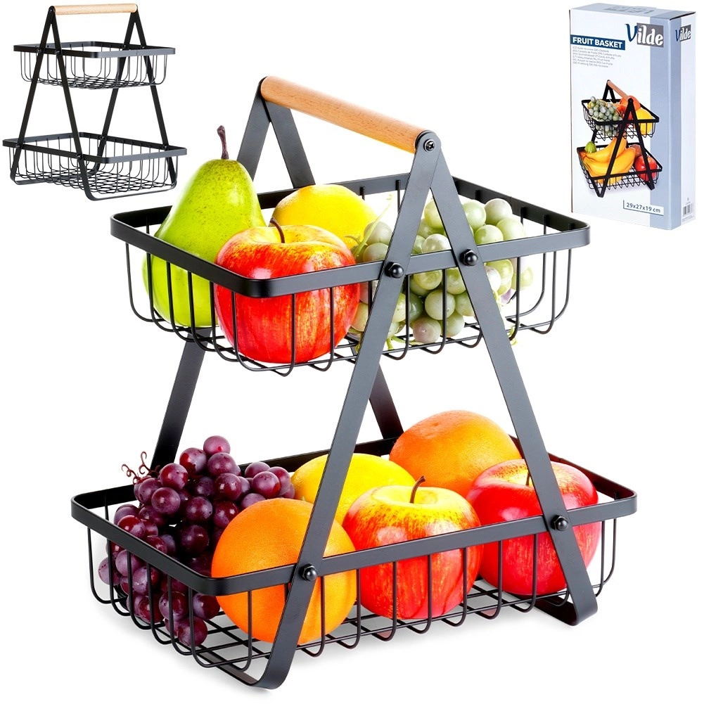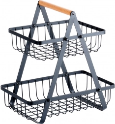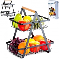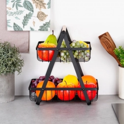 Štýlový dvojposchodový stojan na ovocie a zeleninu kombinuje moderný industriálny dizajn s praktickým vertikálnym ukladaním, ktoré šetrí miesto na kuchynskej linke. Otvorené drôtené koše udržia obsah dobre viditeľný a prevzdušnený, takže jablká, pomaranče aj hrozno zostanú dlhšie čerstvé.
