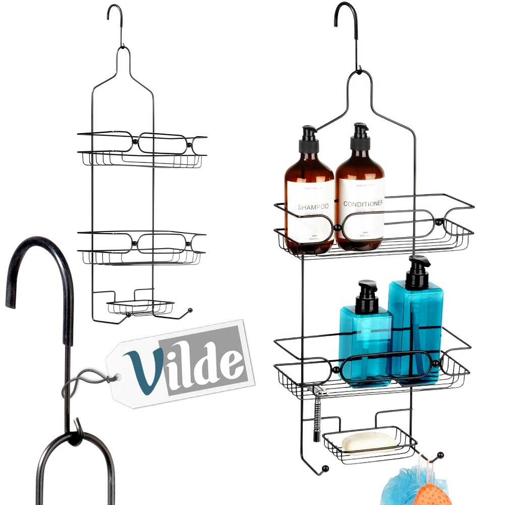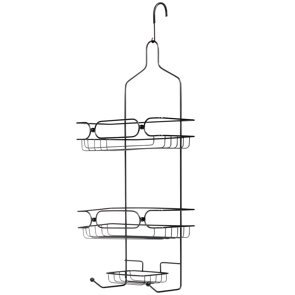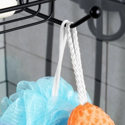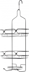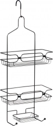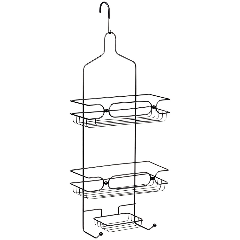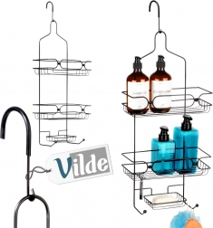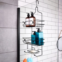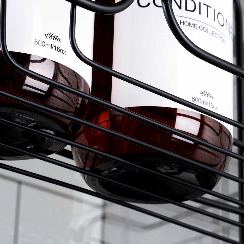 Kvalitný čierno lakovaný kov je pevný a odolný proti korózii, takže polička spoľahlivo vydrží každodenné používanie. Gumový povrch na závesnom háku chráni sklo a zabraňuje pošmyknutiu. Dve veľké police pojmú šampóny a gély, spodná mydelnička a dvojica háčikov sú ideálne pre hubky, žiletky či kefy.
