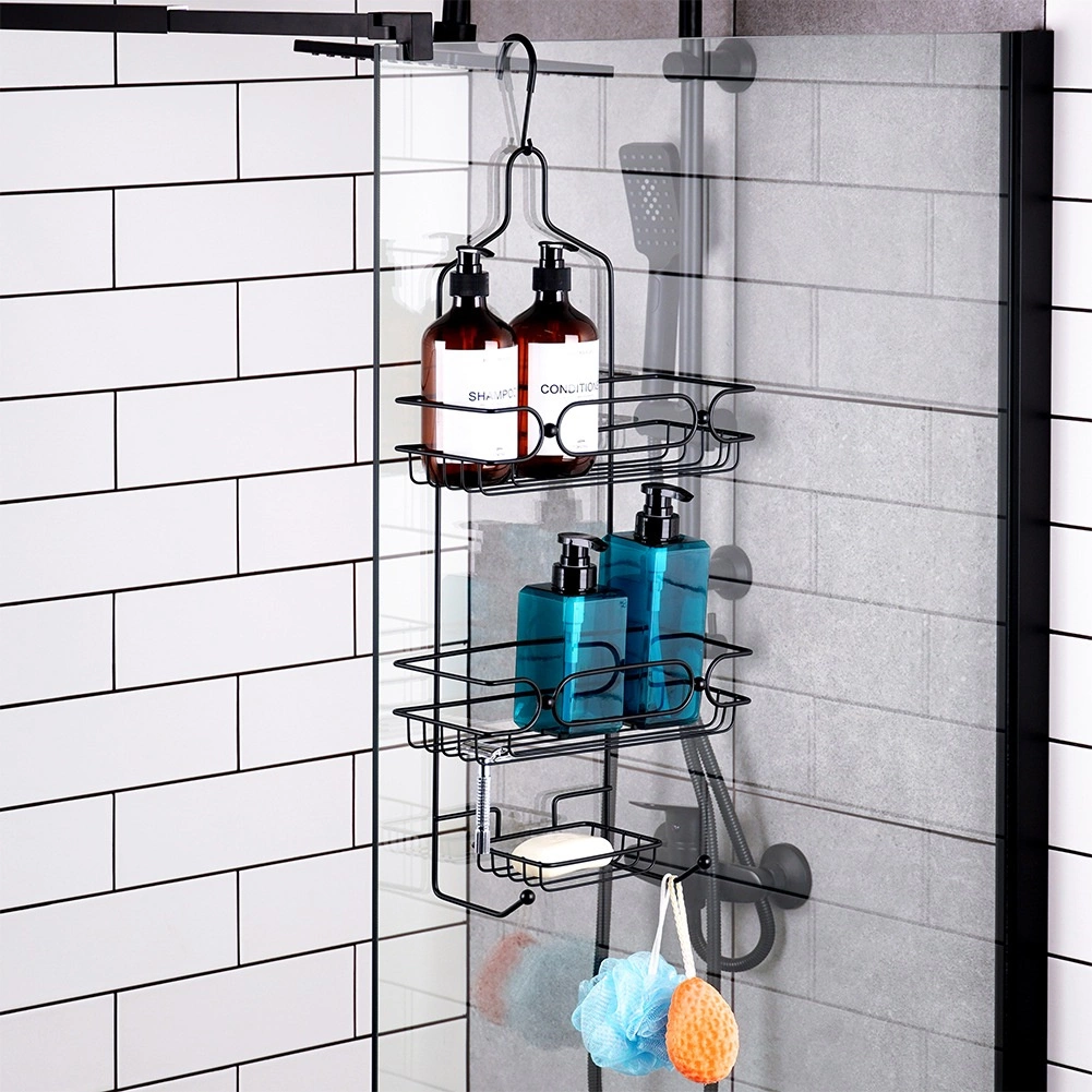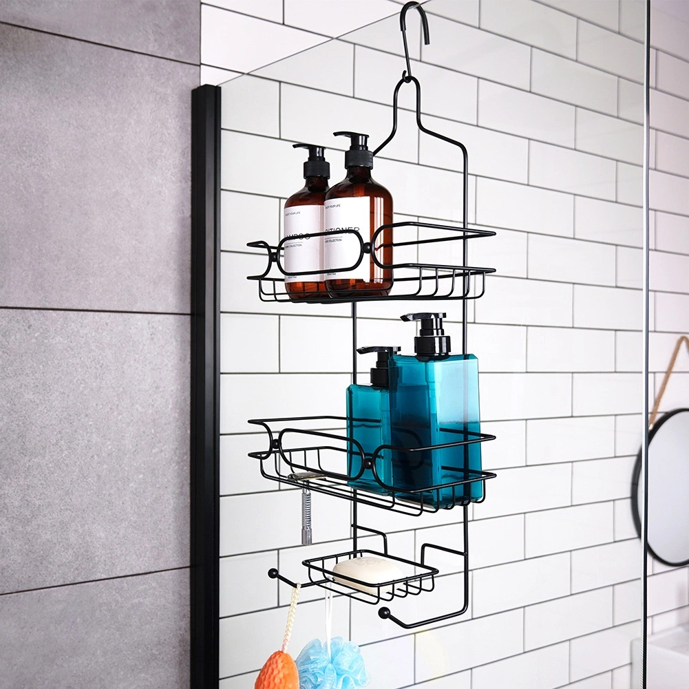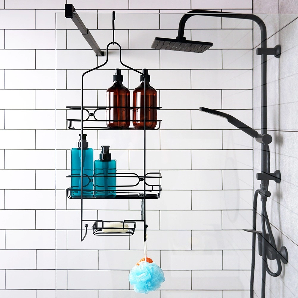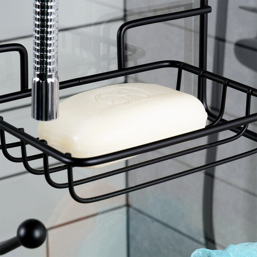 Praktická závesná sprchová polička v elegantnej čiernej farbe udrží vašu kúpeľňu prehľadnú a štýlovú. Ponúka montáž bez vŕtania, odolnú kovovú konštrukciu s antikoróznou úpravou a háčik potiahnutý gumou na bezpečné zavesenie bez poškriabania skla. Dve priestranné police, mydelnička a háčiky na doplnky zaistia všetko po ruke.