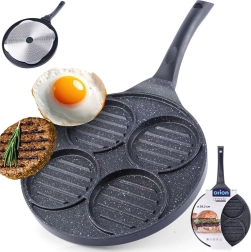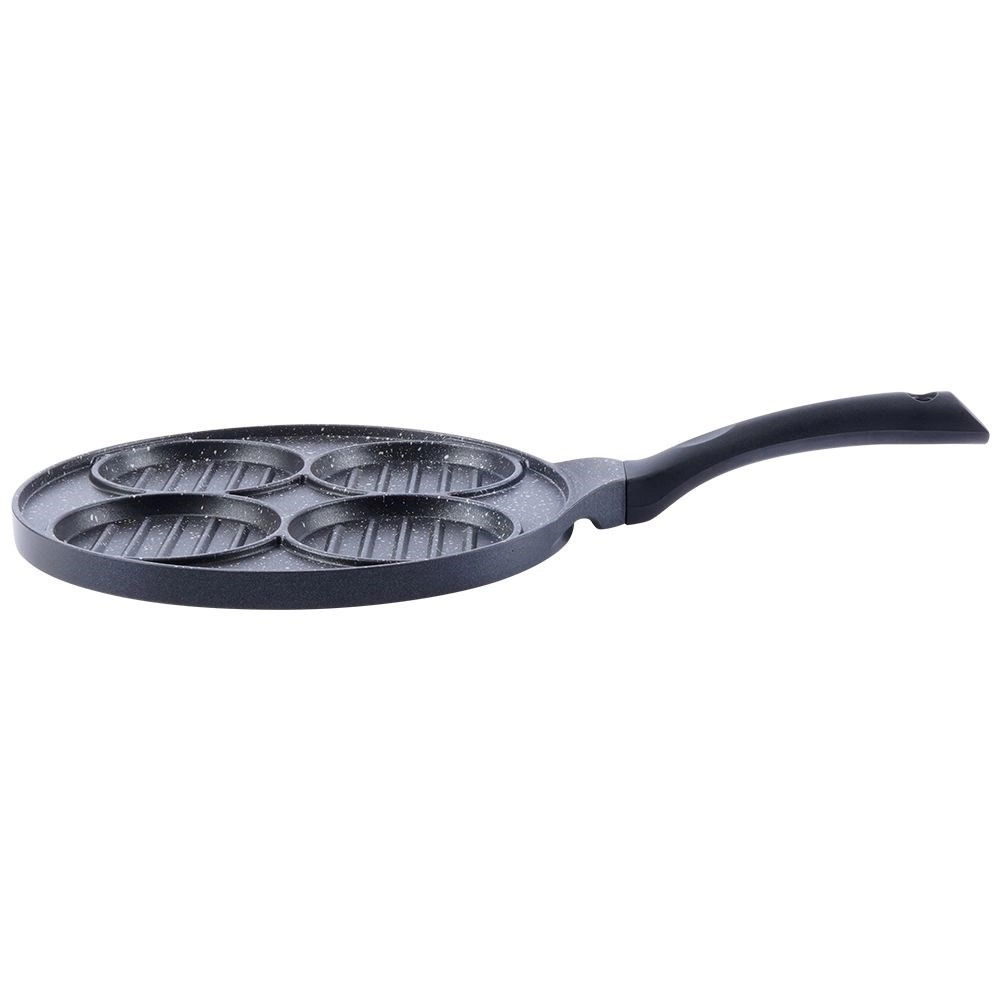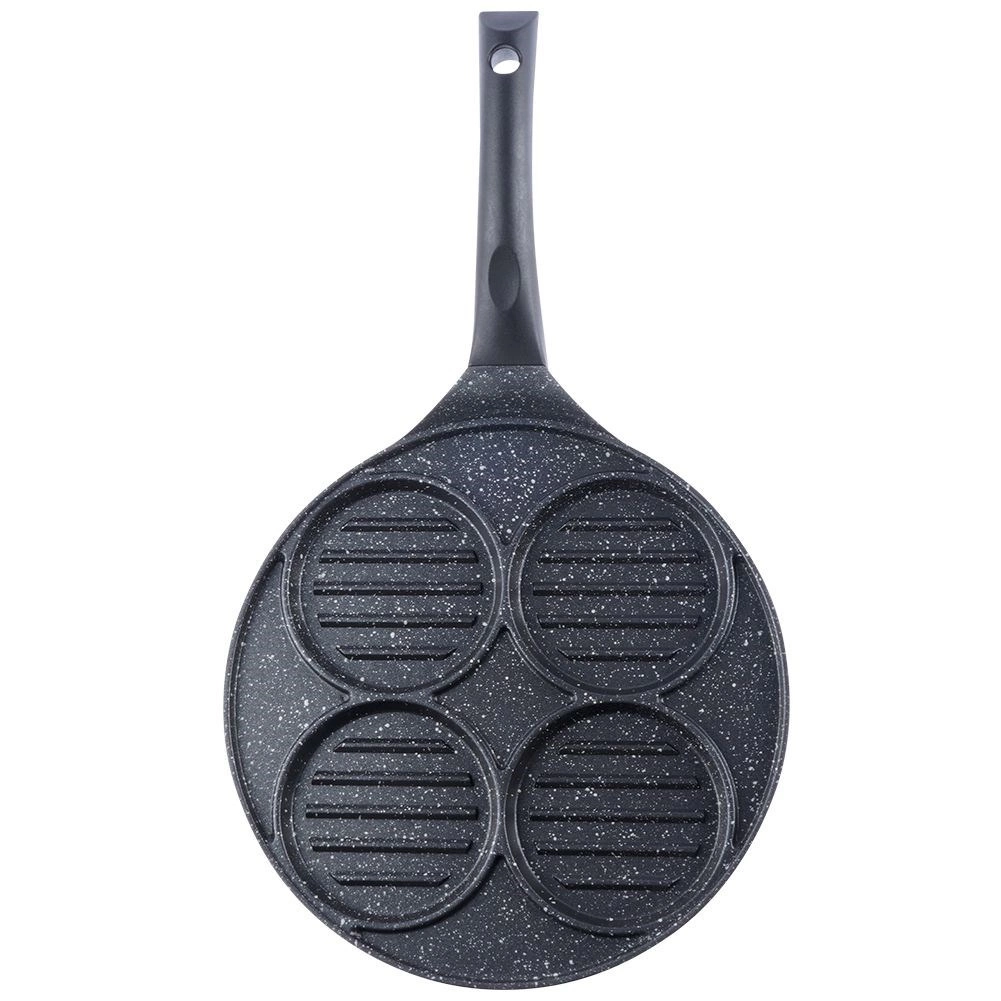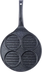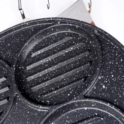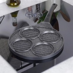 Táto viacúčelová panvica s priemerom 26,5 cm a štyrmi oddelenými kruhovými sekciami (každá cca 10 cm) vám umožní pripraviť burgre, volské oká, lievance či zeleninové placky súčasne a bez miešania chutí. Granitová nepriľnavá vrstva PFLUON GRANIT zabezpečuje minimálne pripálenie, menšiu spotrebu oleja a jednoduché čistenie.