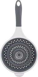 Skladacie silikónové sitko ORION ponúka chytré riešenie pre malé kuchyne aj kempovanie. Odolné telo zo silikónu v sivej farbe dopĺňa pevný biely okraj a ergonomická rukoväť s očkom na zavesenie. Druhé pomocné ucho uľahčí oprenie o hranu hrnca a bezpečné zlievanie.