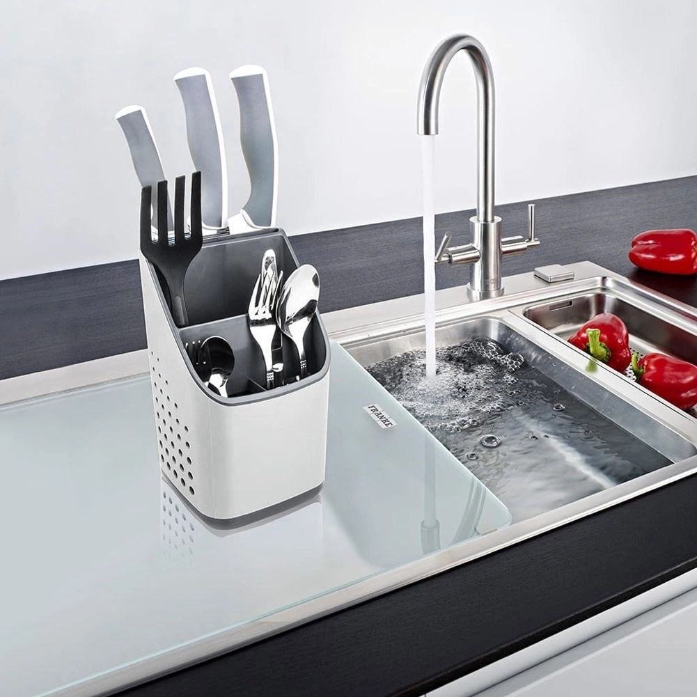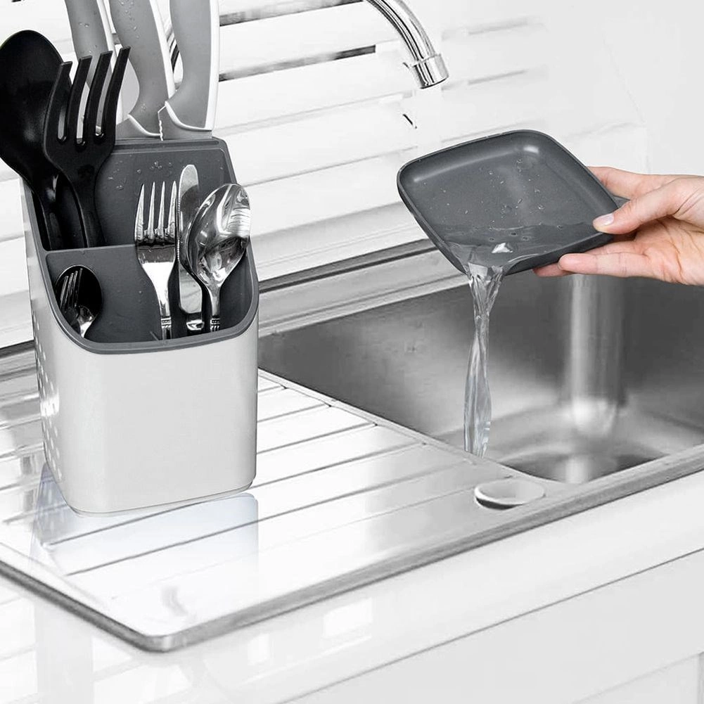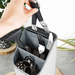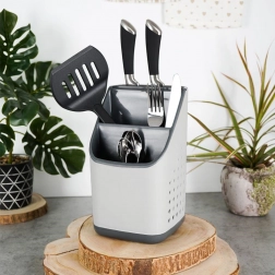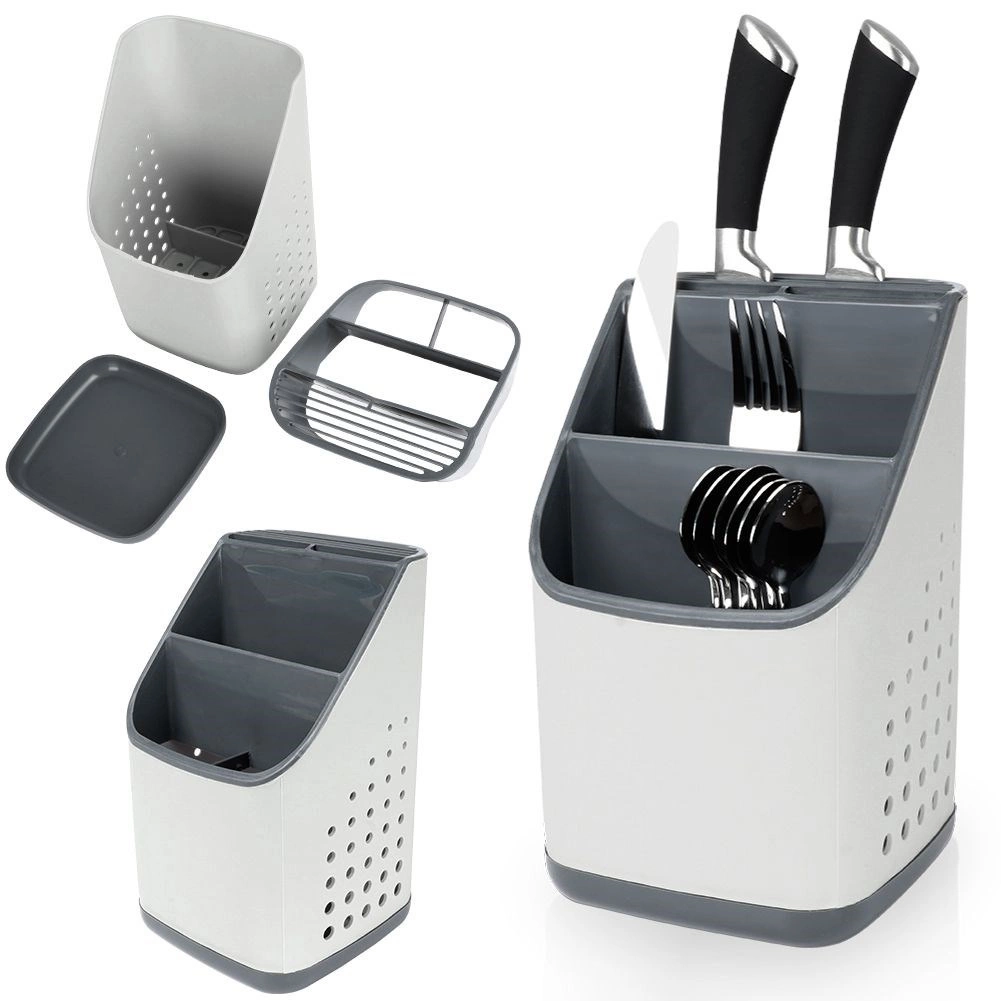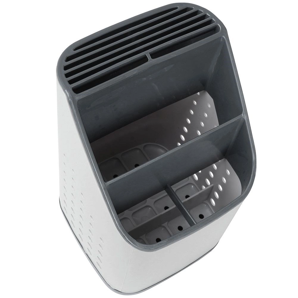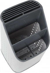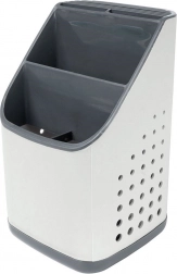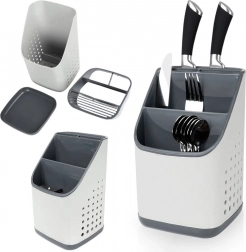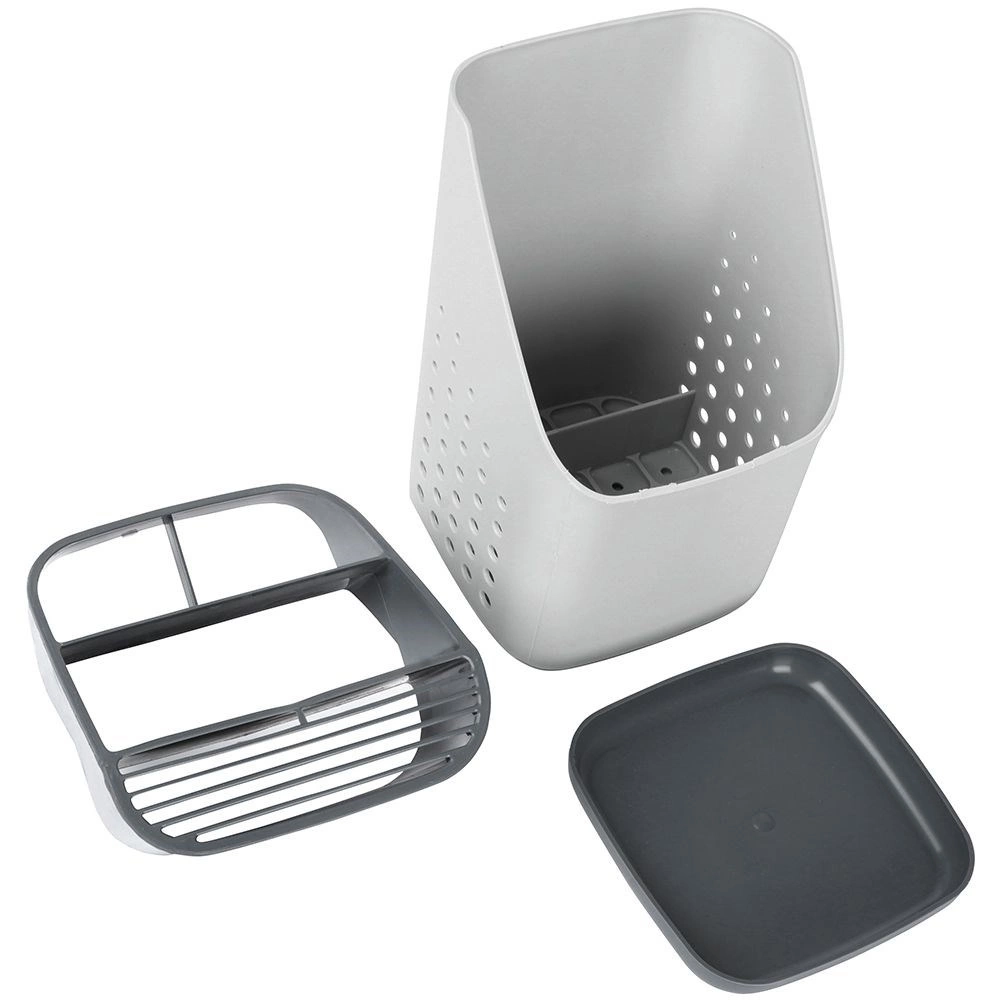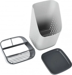 Praktický sivý odkvapkávač a organizér udrží vaše príbory, nože a kuchynské náradie vždy po ruke a prehľadne rozdelené. Vďaka viackomorovému členeniu, odnímateľnej odkvapkávacej miske a vetracím perforáciám príbory rýchlo schnú, nestojá vo vode a kuchynská linka zostáva čistá. Ľahký a odolný plast v kombinácii svetlosivej a grafitovej farby sa hodí do každej modernej kuchyne.