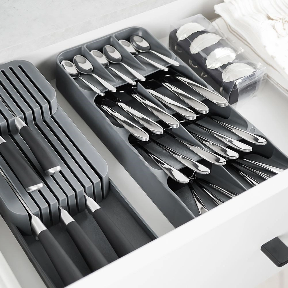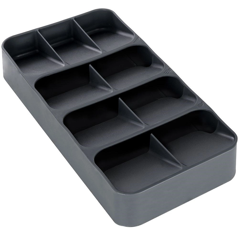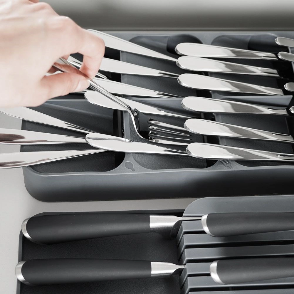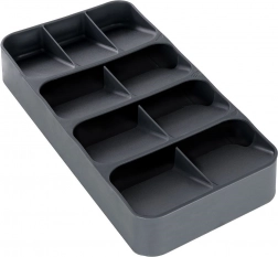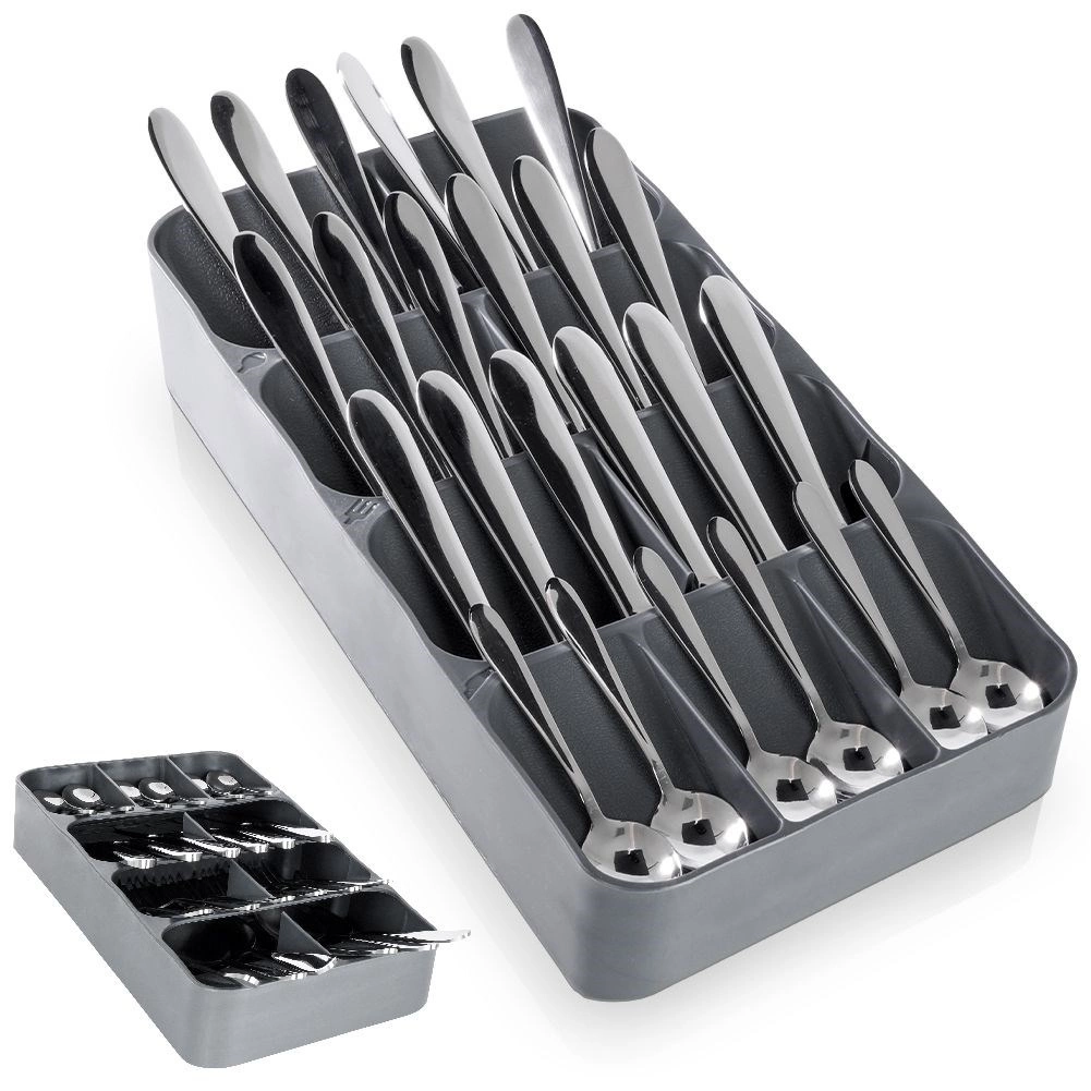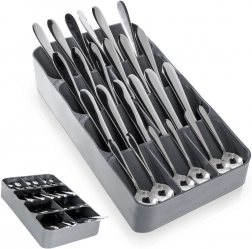 Udržte si poriadok v kuchyni s kompaktným organizérom na príbory Vilde. Vďaka šikovnej, viacúrovňovej konštrukcii a až 9 priehradkám ponúka maximálnu úsporu miesta, prehľadné triedenie vidličiek, lyžíc, nožov aj malých lyžičiek a zároveň bezpečné uloženie nožov. Vyrobený z odolného plastu v elegantnej sivej farbe a prispôsobený tak, aby pasoval do väčšiny kuchynských zásuviek.