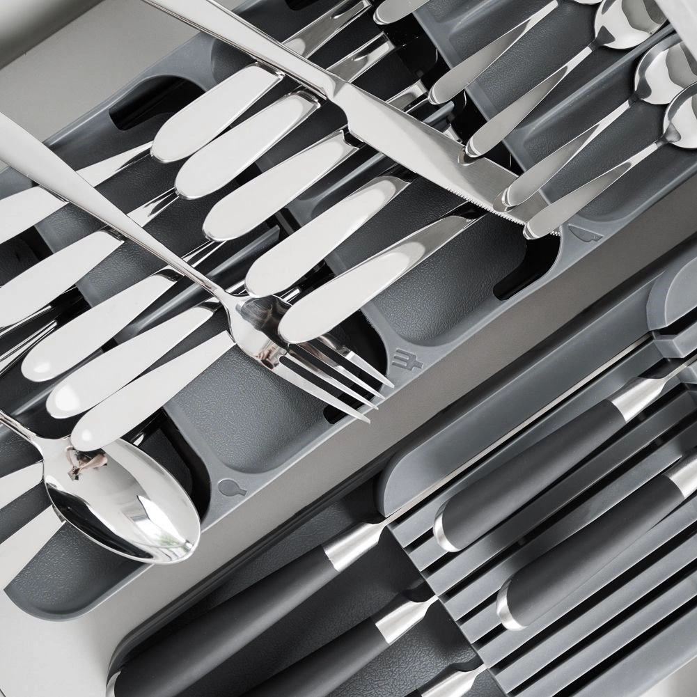 Deväť premyslene rozvrhnutých priehradiek a viacúrovňové usporiadanie udrží všetky príbory na svojom mieste a prehľadne po ruke.