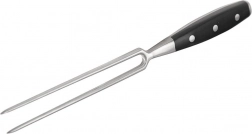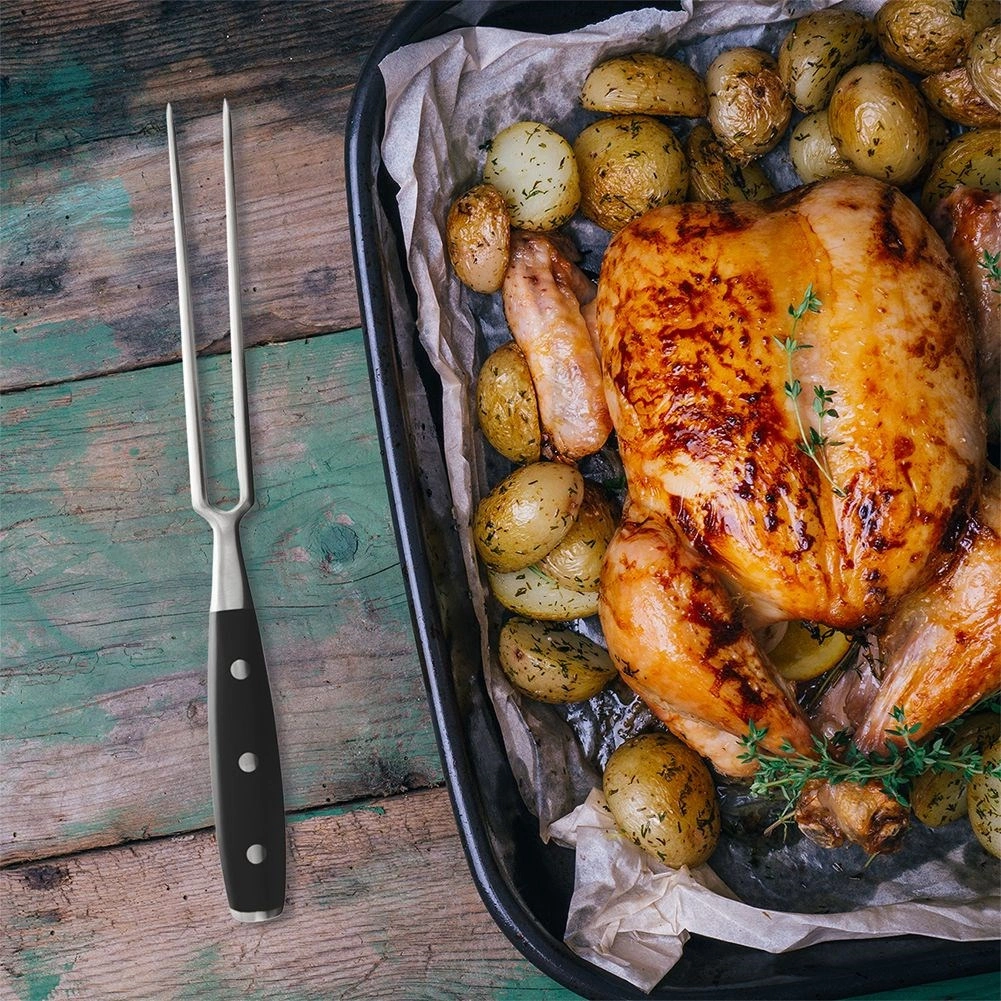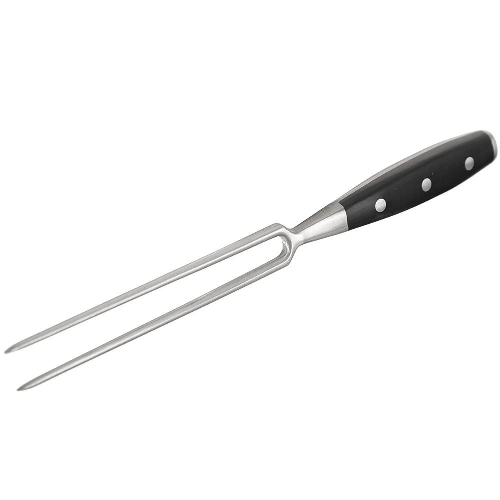 Robustná vidlička na mäso z nehrdzavejúcej ocele ponúkne precíznu kontrolu pri krájaní pečienky, steakov aj hydiny. Dlhé, ostré hroty bezpečne podržia kusy mäsa a umožnia pohodlné porcovanie aj servírovanie. Ergonomická rukoväť z odolného ABS v čiernej farbe sa nešmýka v dlani a vďaka 3-bodovému nitovaniu zaisťuje maximálnu stabilitu.