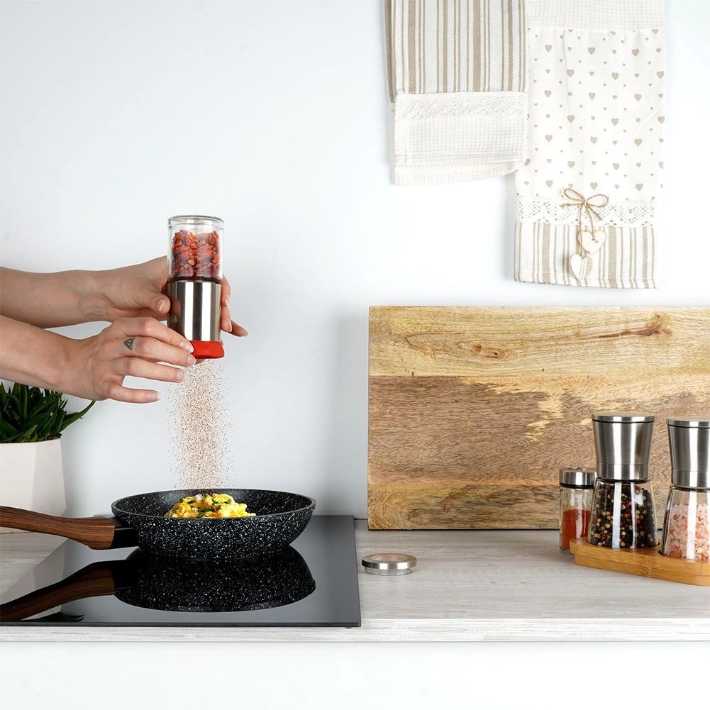 Tento ručný mlynček je navrhnutý pre milovníkov výrazných chutí. Vďaka nerezovému mechanizmu jemne reže sušené chilli papričky, korenie aj bylinky, čím zachováva ich intenzívnu arómu a chuť bez nechceného drvenia. Sklenená nádobka umožní jednoduchú kontrolu množstva aj obsahu.