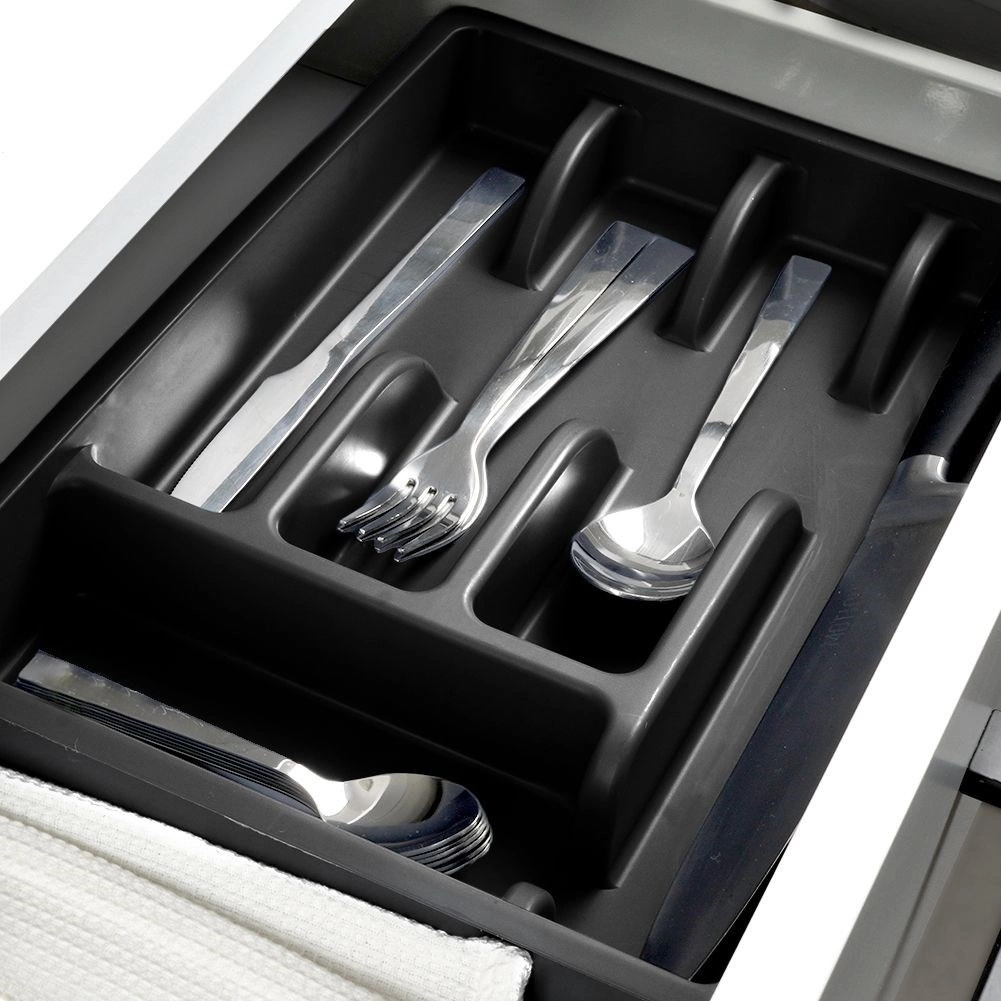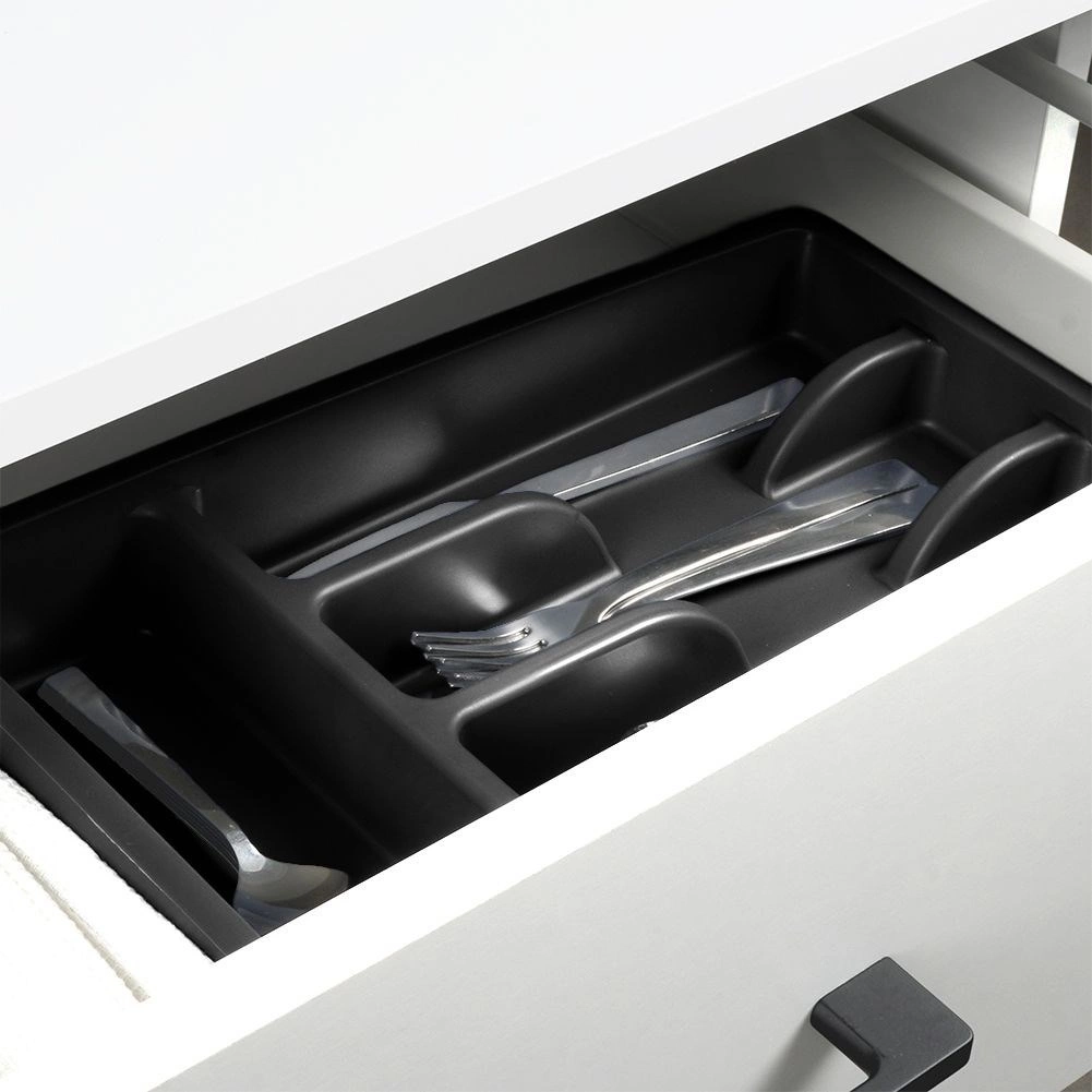 Tri zóny na príbory, samostatná priehradka na lyžičky a dlhý oddiel na kuchynské náradie udržia všetko na svojom mieste.