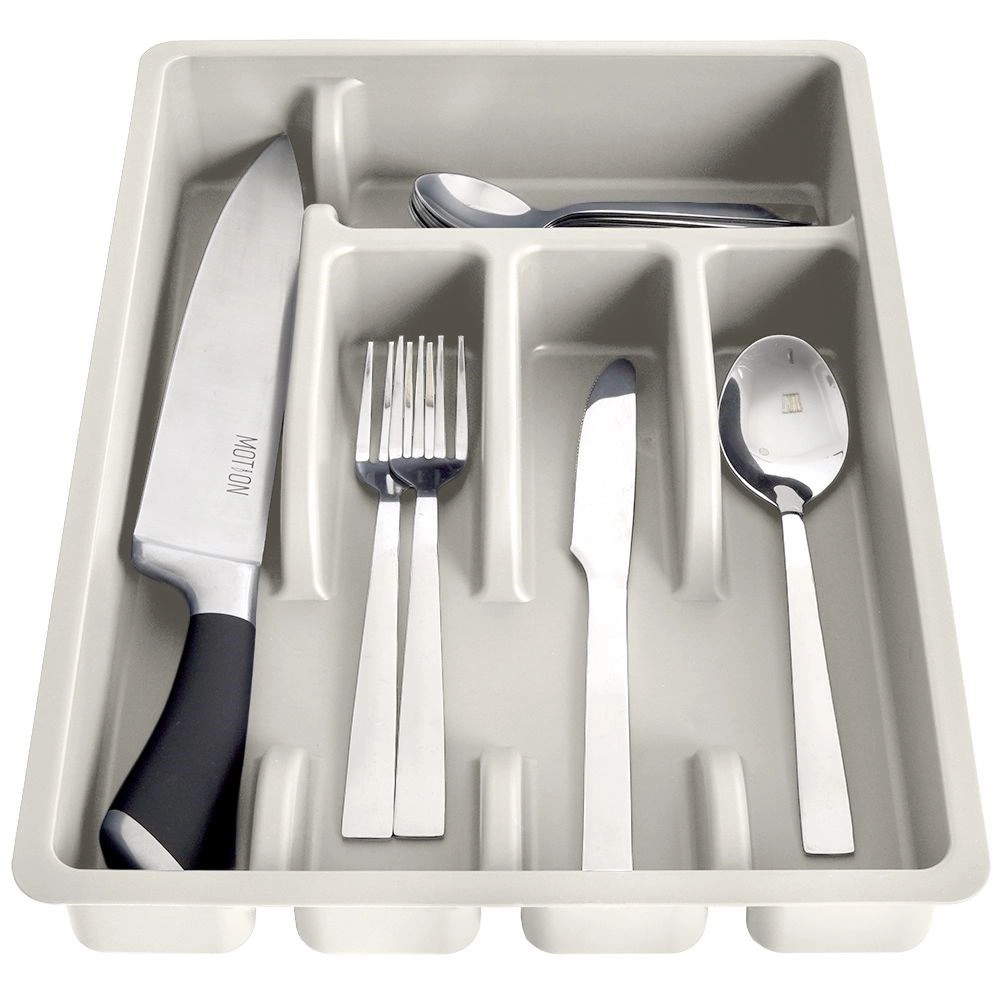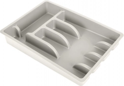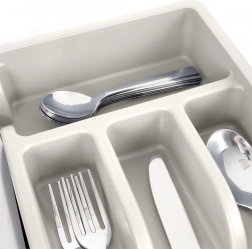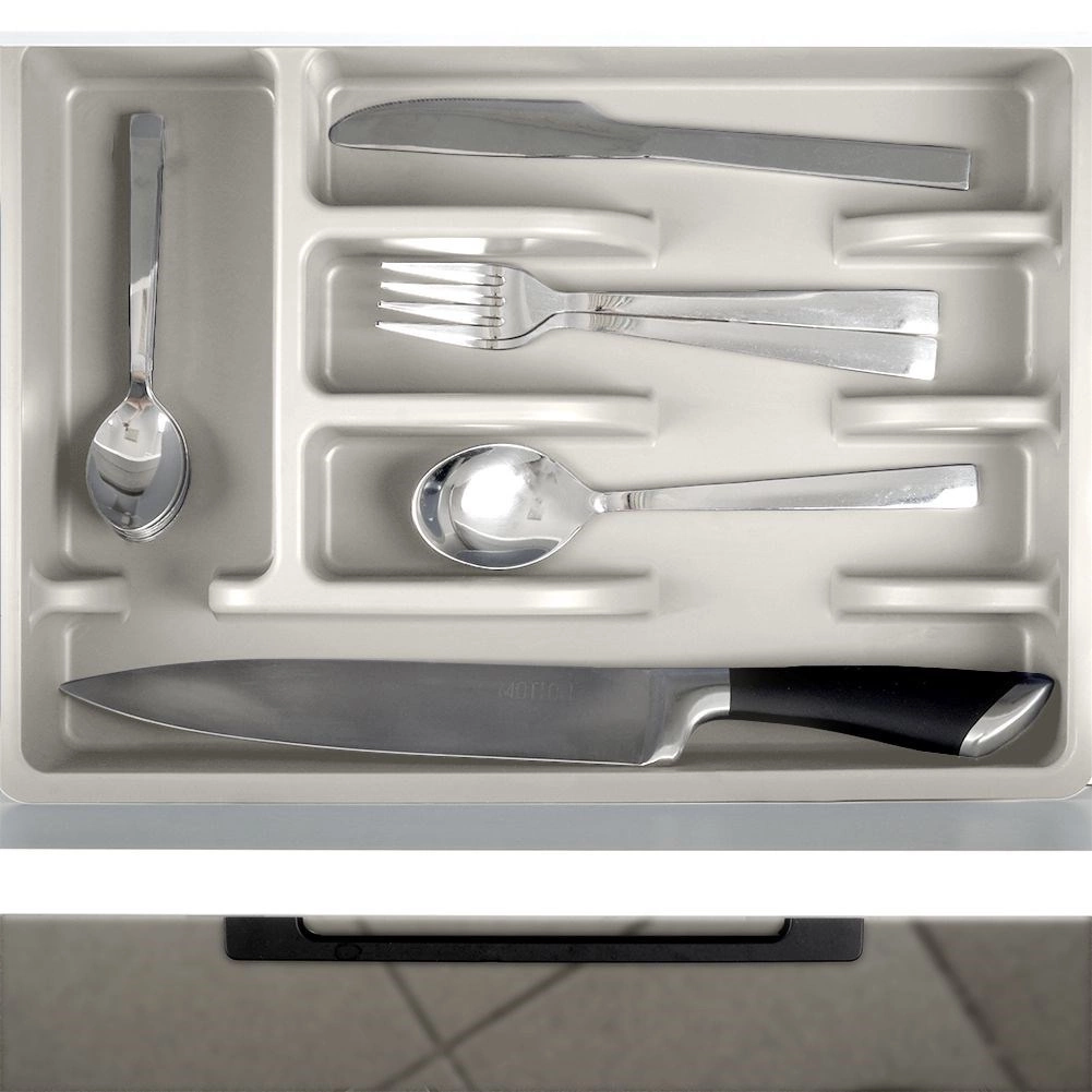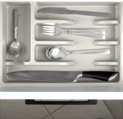 Vložka ponúka päť funkčných priehradiek: tri na základné príbory, jednu na čajové lyžičky a jednu dlhú na metličky, škrabky či nože v puzdre. Hladký povrch sa ľahko čistí a je vhodný do umývačky, takže údržba je rýchla a bez starostí.