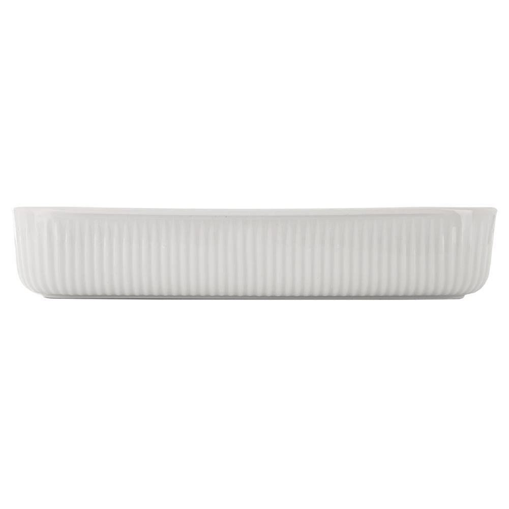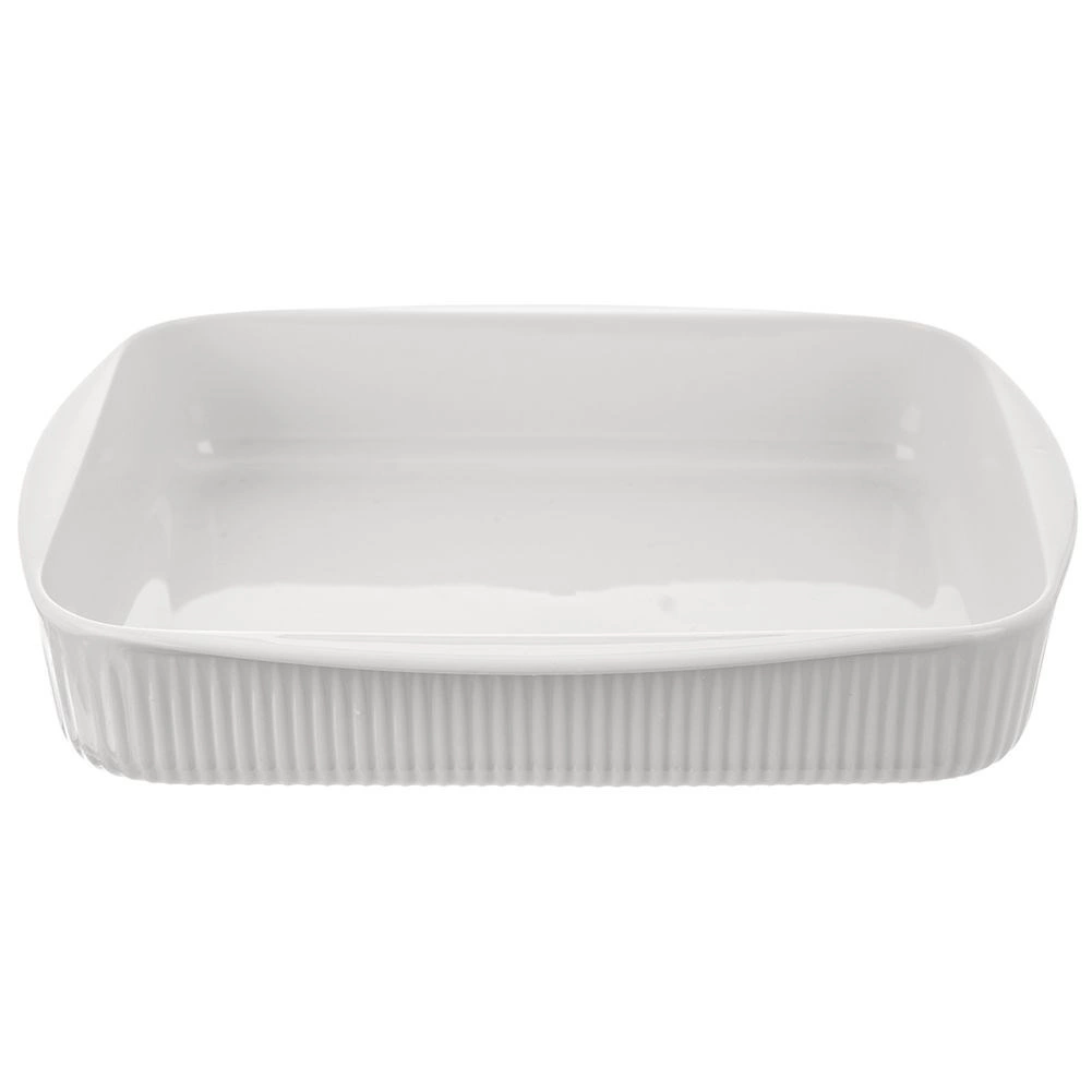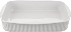 Praktická biela porcelánová zapekacia misa s objemom 2,2 l a rozmermi 30,5 × 24,5 × 5,5 cm na každodenné pečenie aj servírovanie. Vyrobená z kvalitného porcelánu z tradičnej porcelánky v Karlovarskom kraji, vhodná do rúry, mikrovlnnej rúry, chladničky aj umývačky riadu. Rebrovaný vonkajší povrch, hladká vnútorná glazúra pre ľahké vyklápanie a čistenie a integrované bočné úchyty pre pohodlné prenášanie.