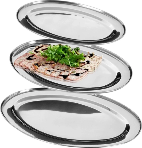 Sada troch oválnych servírovacích podnosov z kvalitnej nehrdzavejúcej ocele v univerzálnej striebornej farbe. Podnosy majú zrkadlovo leštený povrch, ktorý sa ľahko čistí a dodá stolu reprezentatívny vzhľad. Vďaka pevnému spracovaniu sa nekrútia a zvládnu každodenné používanie.