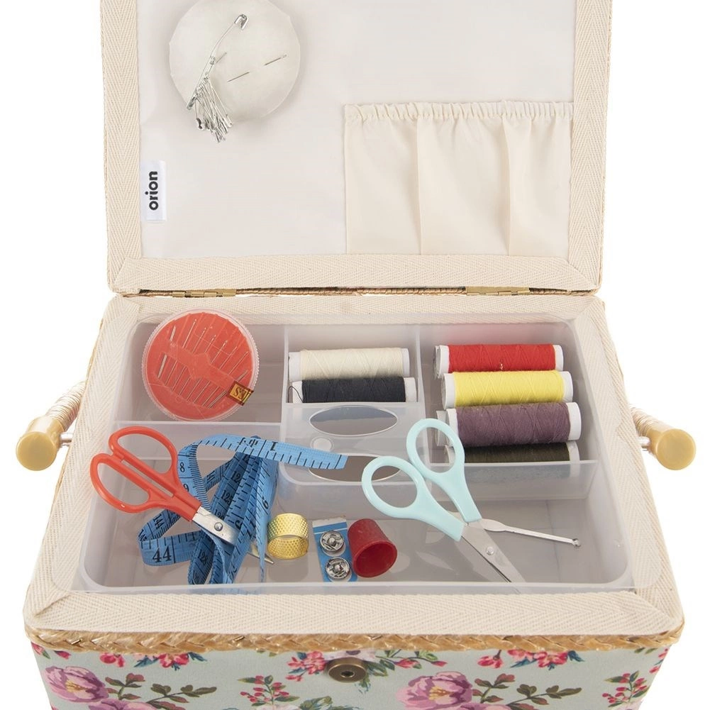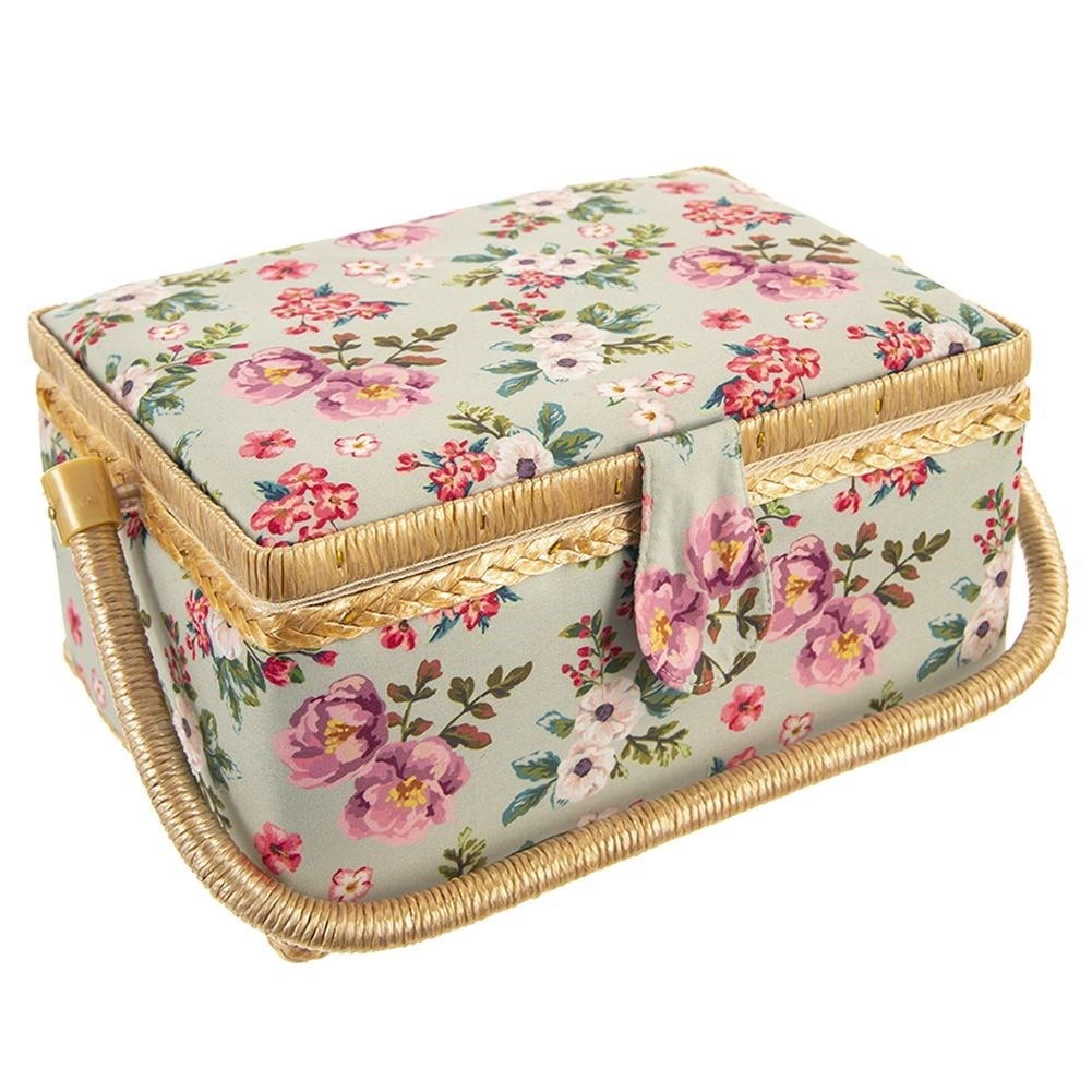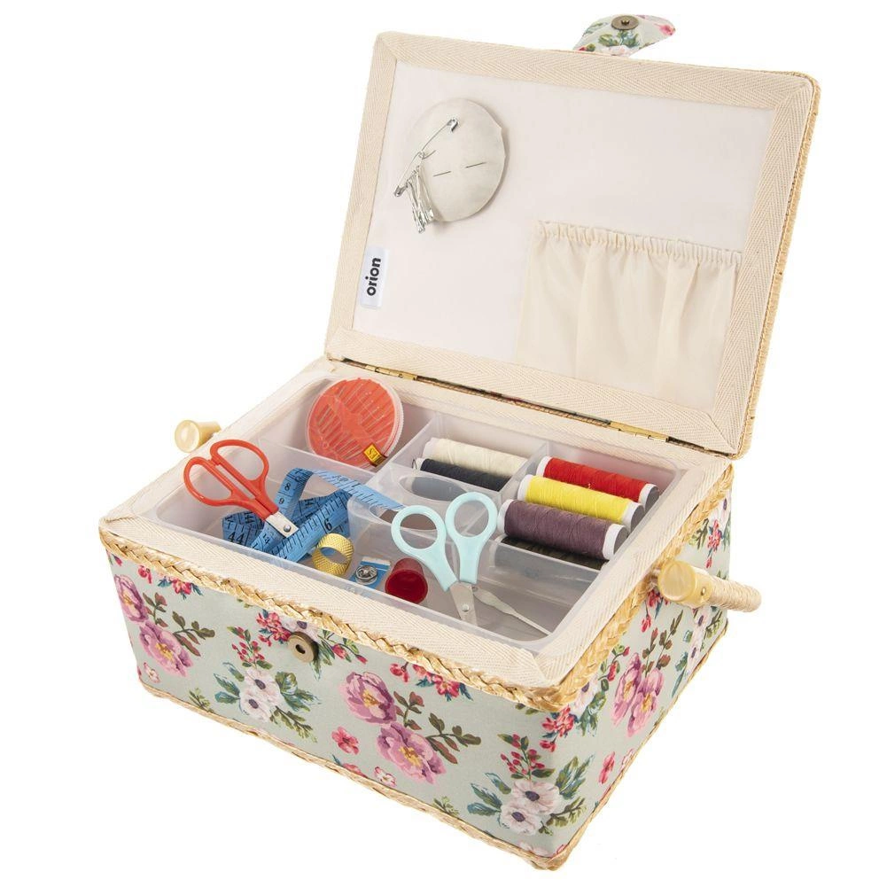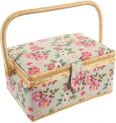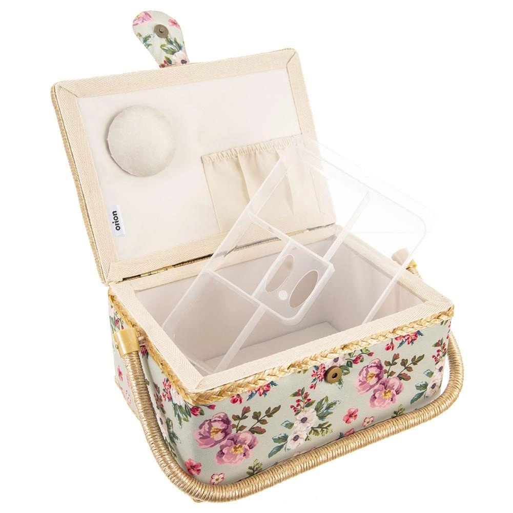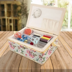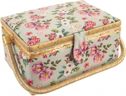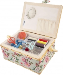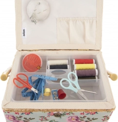 Elegantná škatulka na nite v podobe praktického košíka s kvetinovým vzorom na prehľadné uloženie šijacích potrieb. Ponúka vyberateľný transparentný organizér so 4 priehradkami, magnetické zatváranie na bezpečné prenášanie a skladaciu rukoväť na pohodlné nosenie. Vo vnútri nechýba vrecko a ihlovník na špendlíky a ihly.