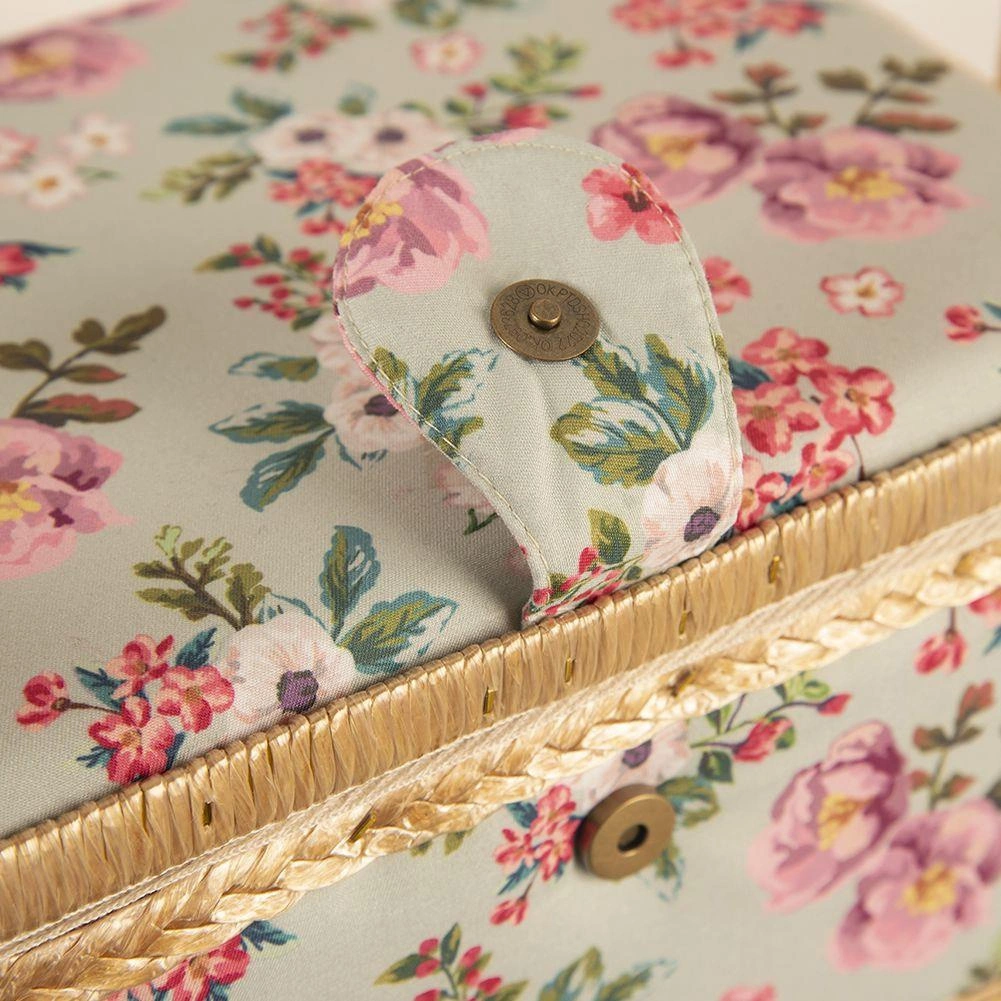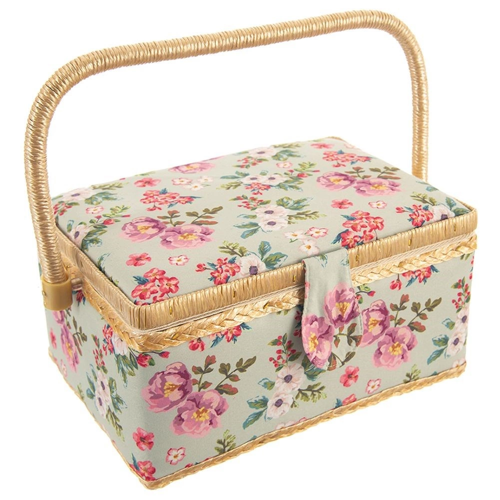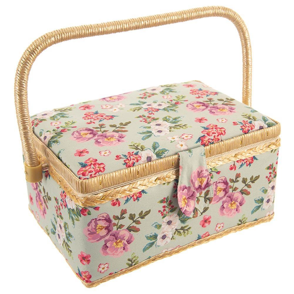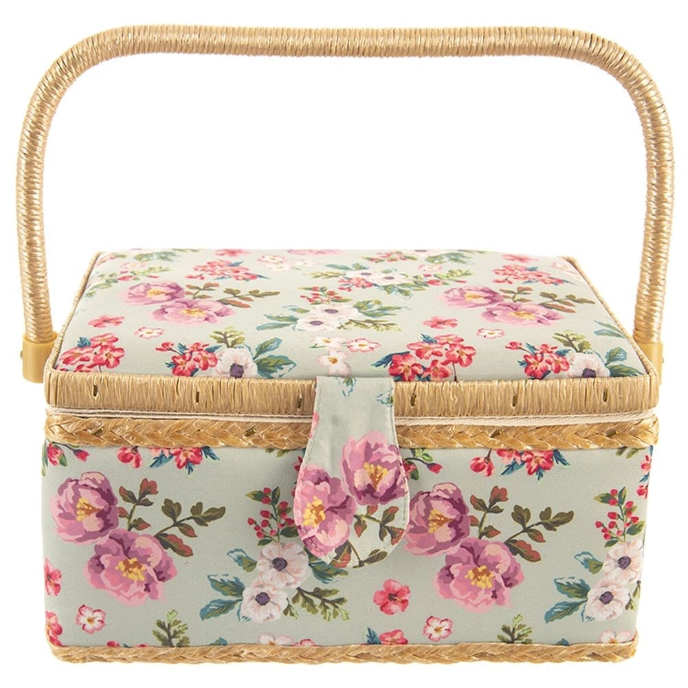 Elegantná škatulka na nite v podobe praktického košíka s kvetinovým vzorom na prehľadné uloženie šijacích potrieb. Ponúka vyberateľný transparentný organizér so 4 priehradkami, magnetické zatváranie na bezpečné prenášanie a skladaciu rukoväť na pohodlné nosenie. Vo vnútri nechýba vrecko a ihlovník na špendlíky a ihly.