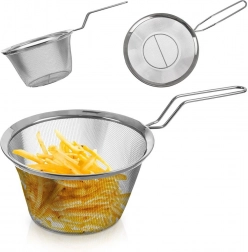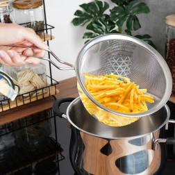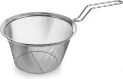Univerzálny kuchynský košík je skvelý pomocník na každodenné varenie. Vďaka jemnej nerezovej sieťke ľahko a rýchlo precedíte cestoviny, zeleninu alebo vyprážate hranolčeky a chrumkavé lupienky. Dlhé madlo zaistí pohodlné a bezpečné držanie nad hrncom či panvicou.