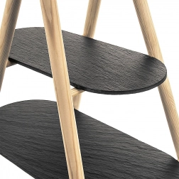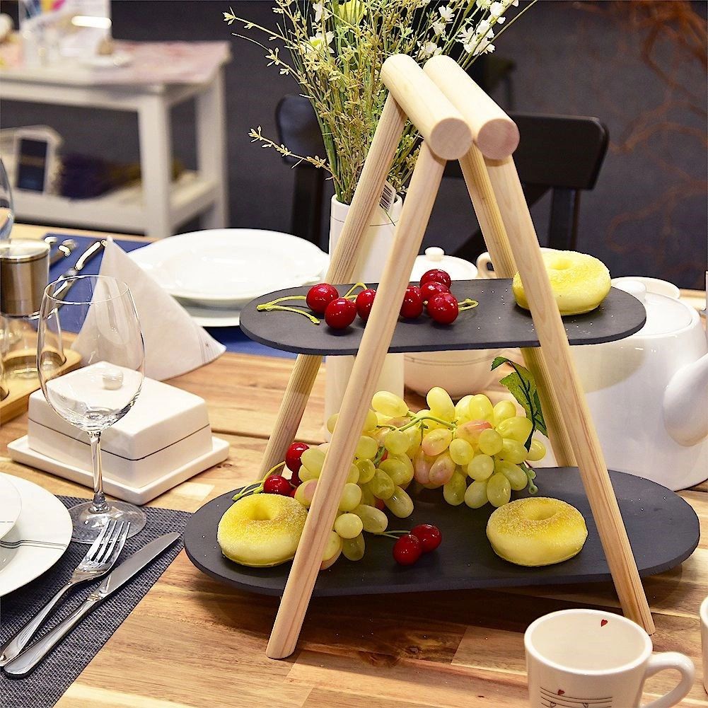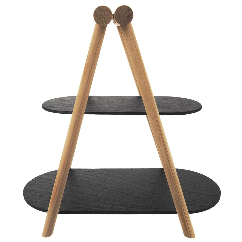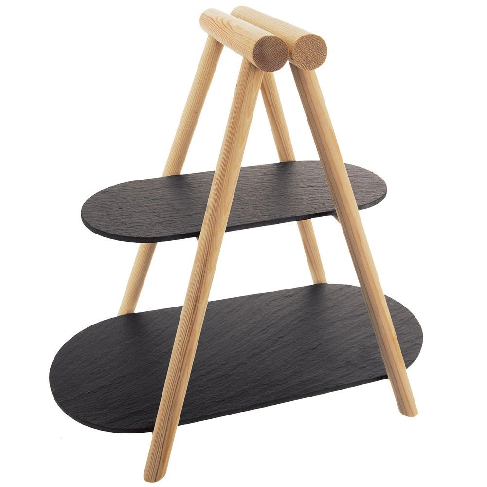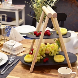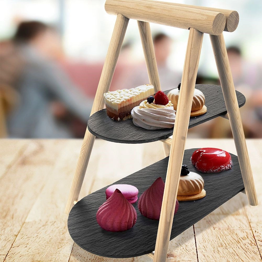 Tento dizajnový dvojposchodový etažér skvele vynikne na každom stole. Spojenie svetlého dreva a tmavých bridlicových podnosov pôsobí moderne a pritom nadčasovo. Vďaka dvom úrovniam šetrí miesto a umožní efektnú prezentáciu zákuskov, ovocia, syrov, údenín či jednohubiek.
