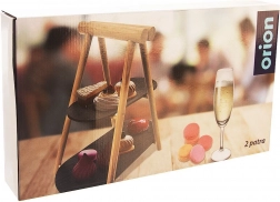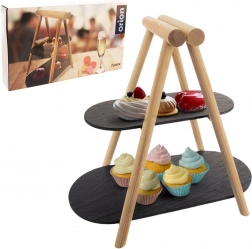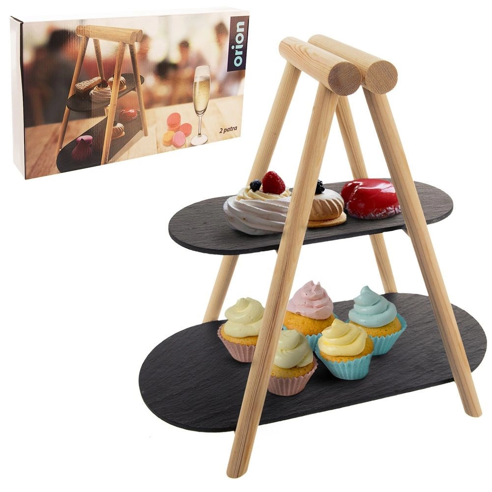 Štýlový dvojposchodový etažér na servírovanie a prezentáciu dezertov, syrov aj snackov. Kombinuje prírodné drevo s bridlicovými miskami, ponúka stabilnú konštrukciu, dve priestranné úrovne a praktické madlo na ľahké prenášanie. Ideálny na domáce stolovanie aj sladké bary na oslavách.