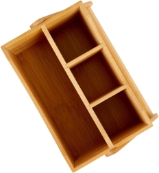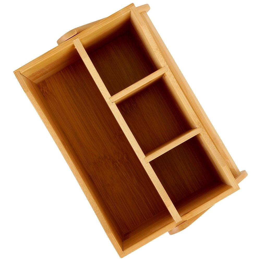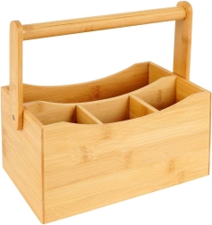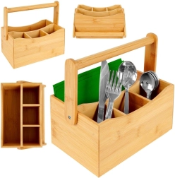Tento univerzálny drevený organizér je skvelým pomocníkom pre organizáciu a servis v domácnosti aj gastronómii. Štyri priehradky – tri menšie a jedna väčšia – pojmú príbory, obrúsky, dochucovadlá, omáčky aj drobné kuchynské náradie. Robustné madlo zaisťuje bezpečné a pohodlné prenášanie z kuchyne na terasu či záhradu.