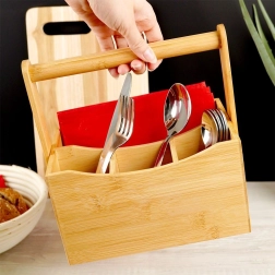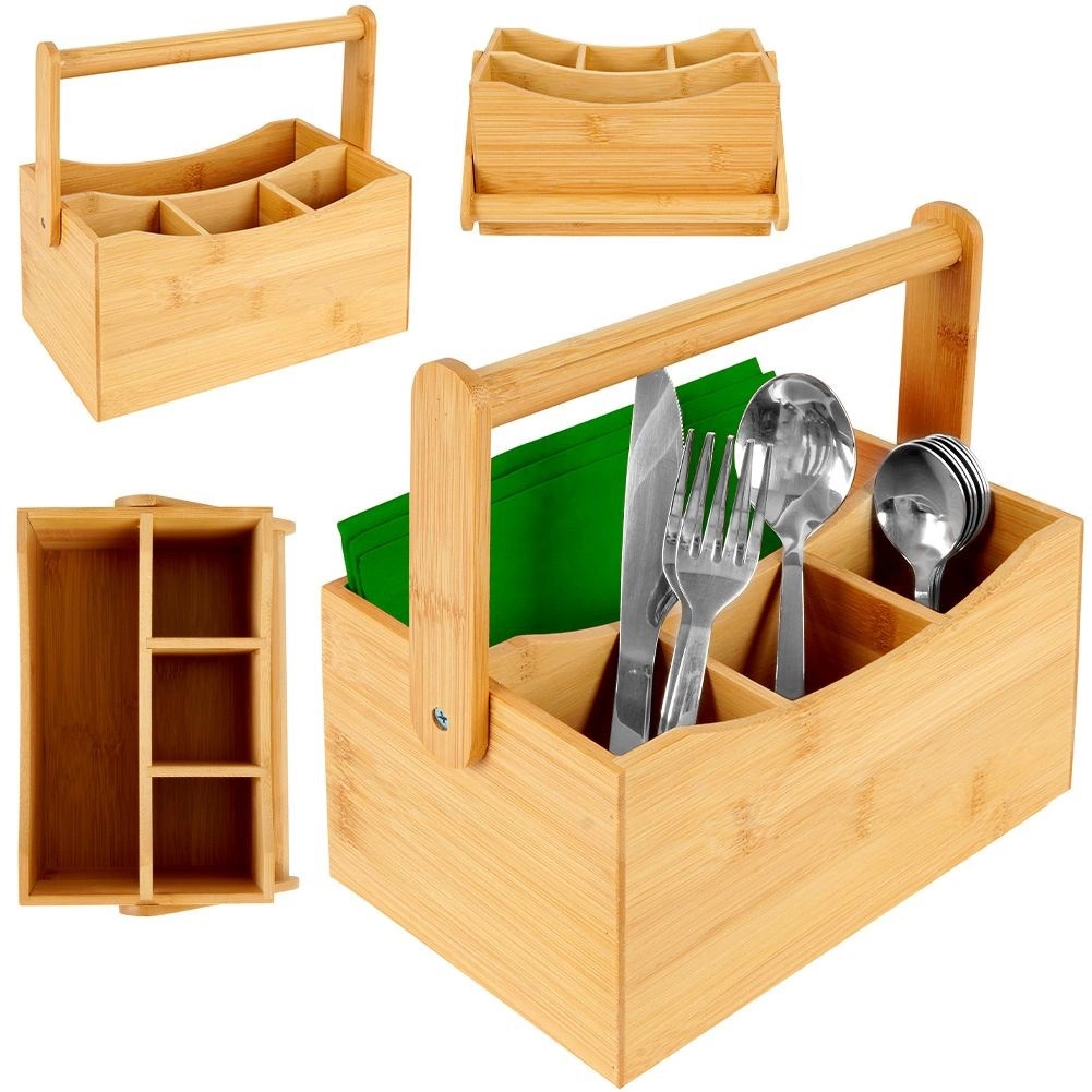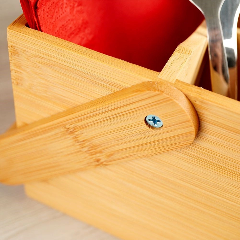 Organizér je vyrobený z bambusového dreva, ktoré vyniká prirodzenou odolnosťou, nízkou hmotnosťou a elegantným vzhľadom. Hodí sa na domáci stôl, do reštaurácií, bistier aj cateringových služieb, kde uľahčí servírovanie omáčok, korenín a príborov.