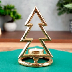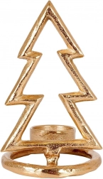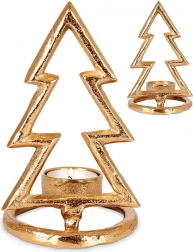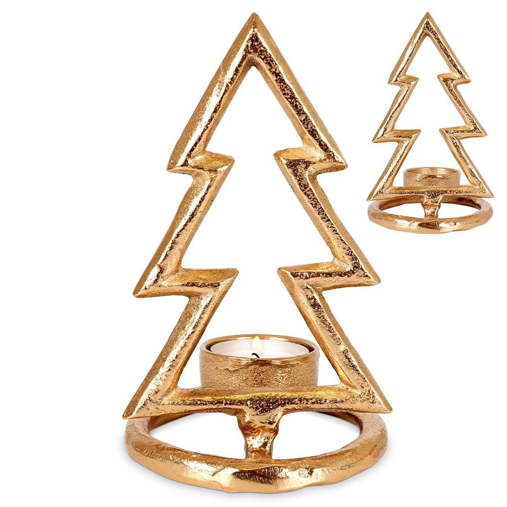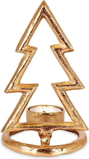 Štýlový svietnik v tvare vianočného stromčeka z kvalitného hliníka v zlatej farbe pre čajové sviečky s priemerom do 4 cm. Ponúka elegantný minimalistický dizajn, stabilnú okrúhlu základňu a odolné prevedenie v modernom loft štýle – ideálna dekorácia na sviatočný stôl aj komodu.