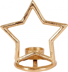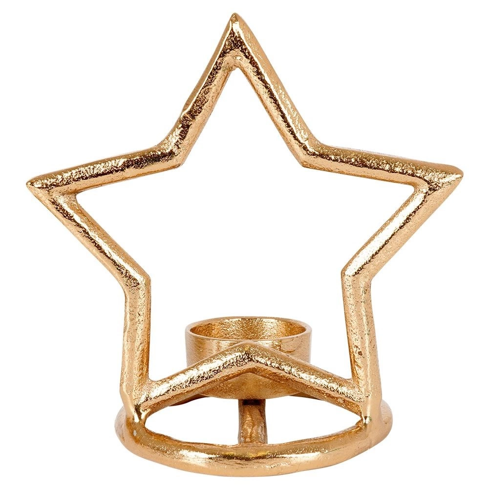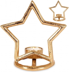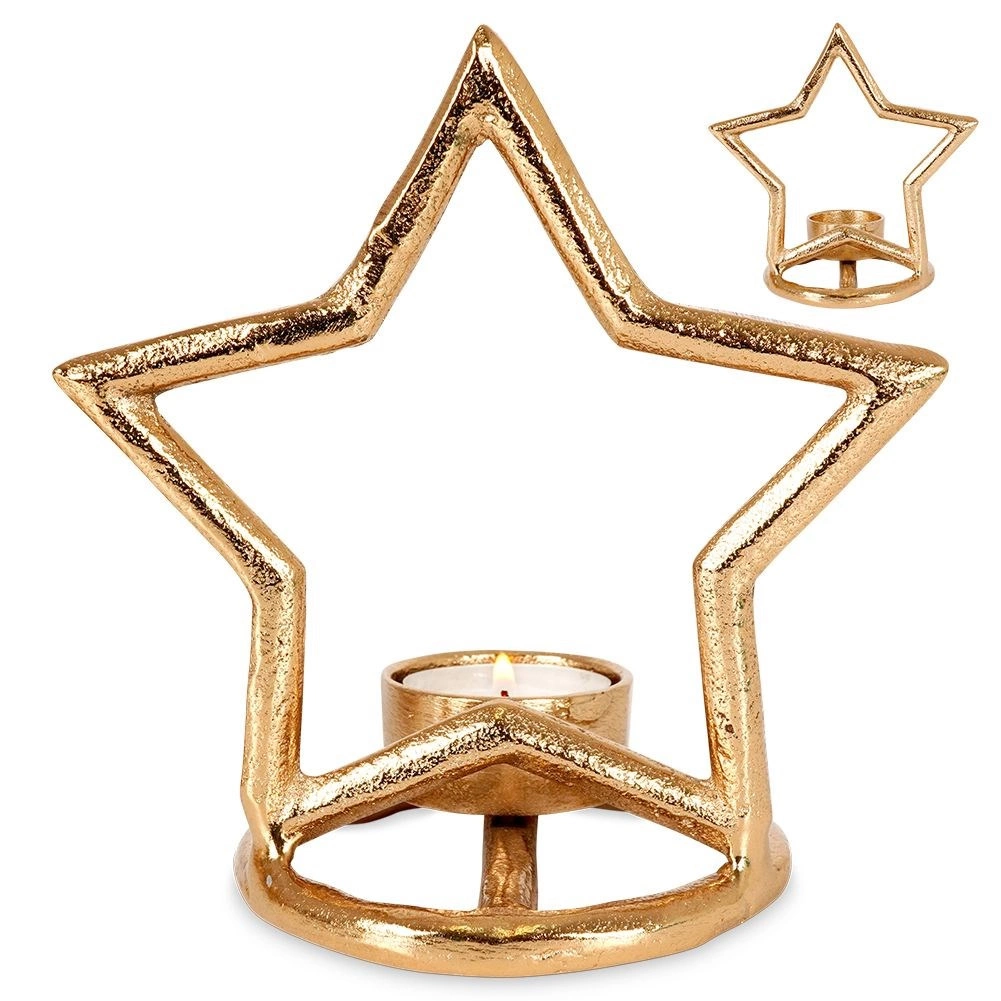Elegantný svietnik v tvare hviezdy z kvalitného hliníka v modernej zlatej farbe krásne rozžiari stôl, policu aj komodu. Je ideálny pre čajové sviečky (tealighty) a vďaka stabilnej kruhovej základni stojí bezpečne na akomkoľvek povrchu. Minimalistický vzhľad ľahko zladíte s interiérmi v štýle LOFT, industriál aj škandinávsky.