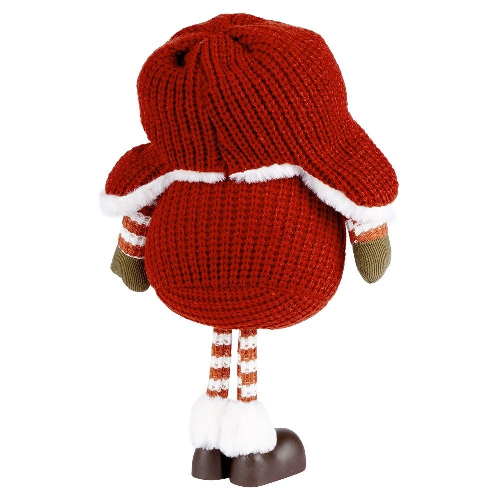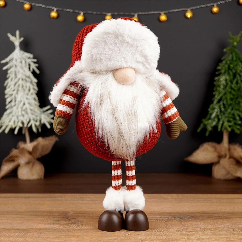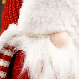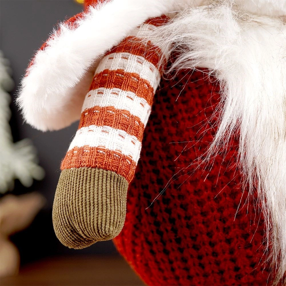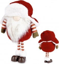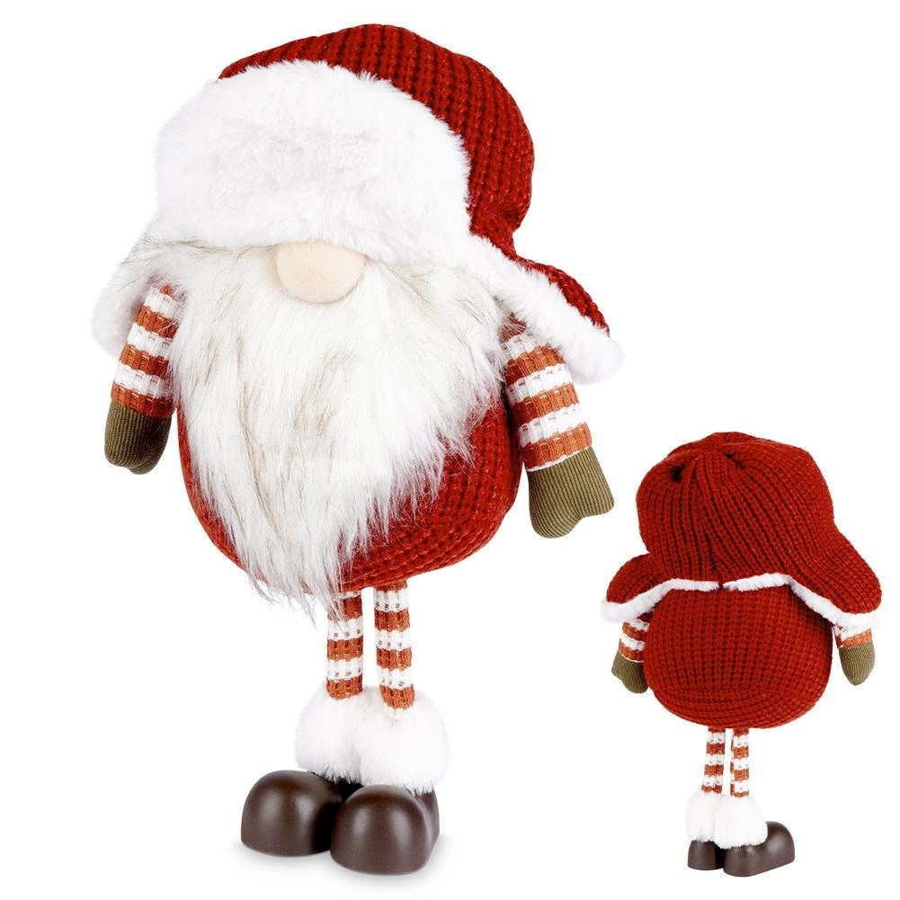Červený pletený odev, kožušinkový lem a bohatý biely fúz dodávajú dekorácii hrejivý, tradičný vianočný nádych, ktorý zapadne do každého interiéru.