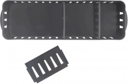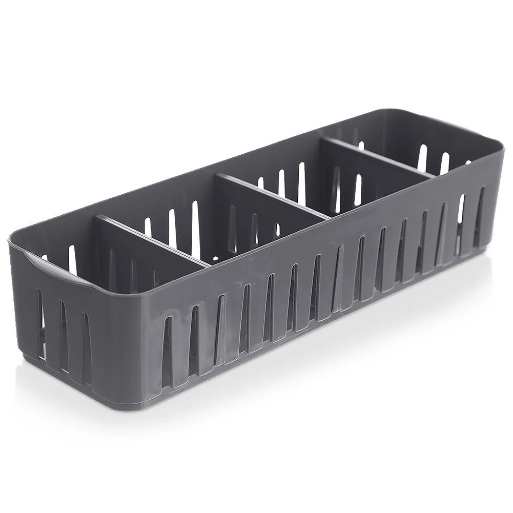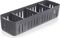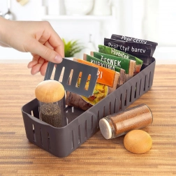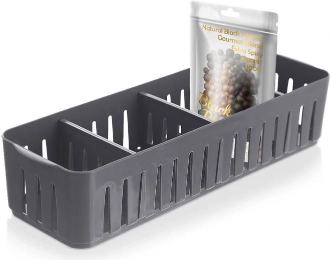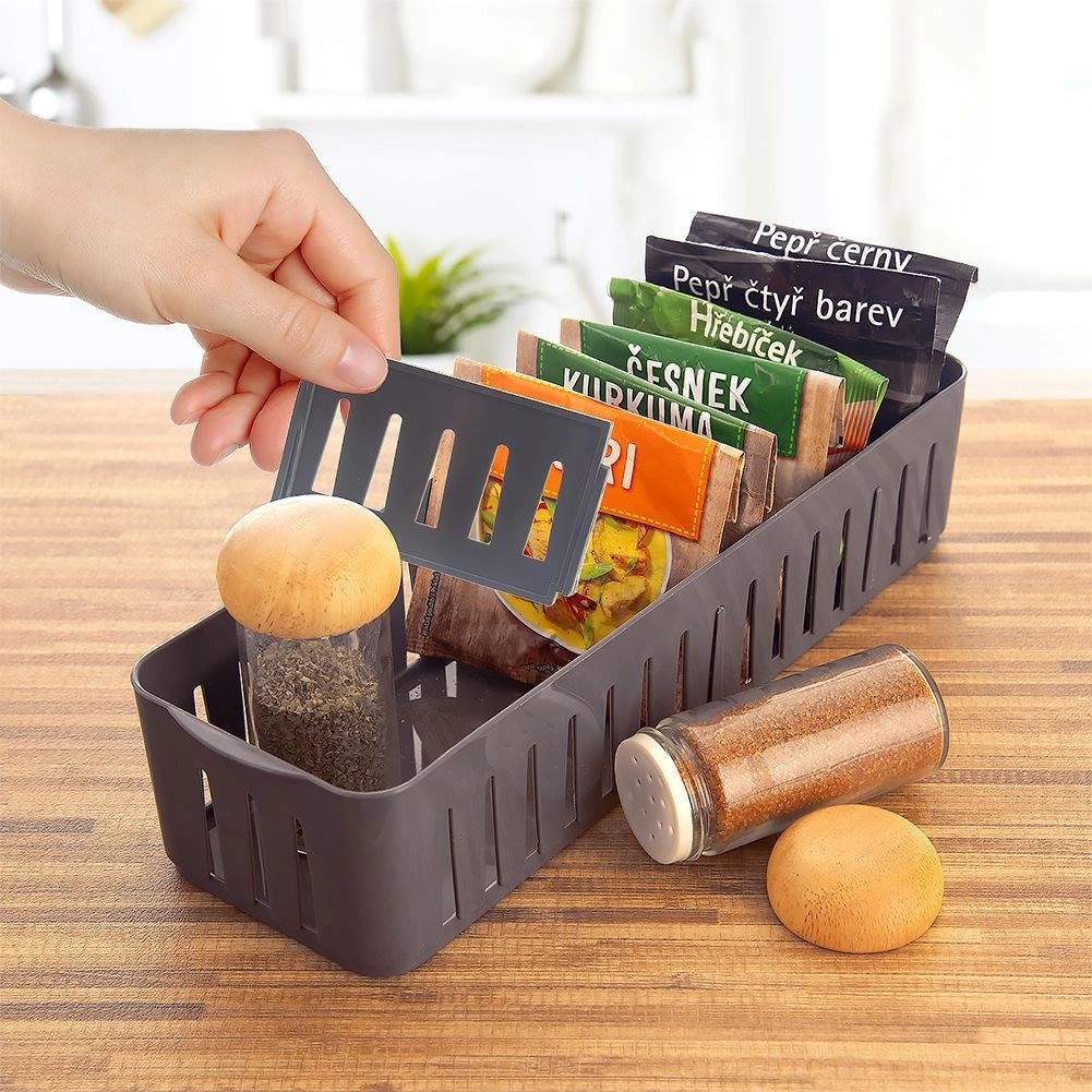 Praktický kuchynský organizér na koreniny s vyberateľnými priečkami udrží vaše vrecúška s koreninami prehľadne na jednom mieste. Je z odolného, ľahkého plastu v sivej farbe a vďaka rozdeleniu na štyri sekcie ľahko roztriedite koreniny podľa typu. Hodí sa do skrinky, zásuvky aj na pracovnú dosku a možno ho umývať v umývačke. Prehľadné triedenie, pevné prevedenie, jednoduchá údržba.