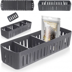 Urobte poriadok medzi vrecúškami s koreninami a bylinkami. Tento sivý organizér s kompaktnými rozmermi ponúka premyslené rozdelenie priestoru a udrží aj otvorené vrecúška bezpečne vo zvislej polohe – bez vysýpania a chaosu v zásuvke. Vďaka vyberateľným priečkam si usporiadanie ľahko prispôsobíte.