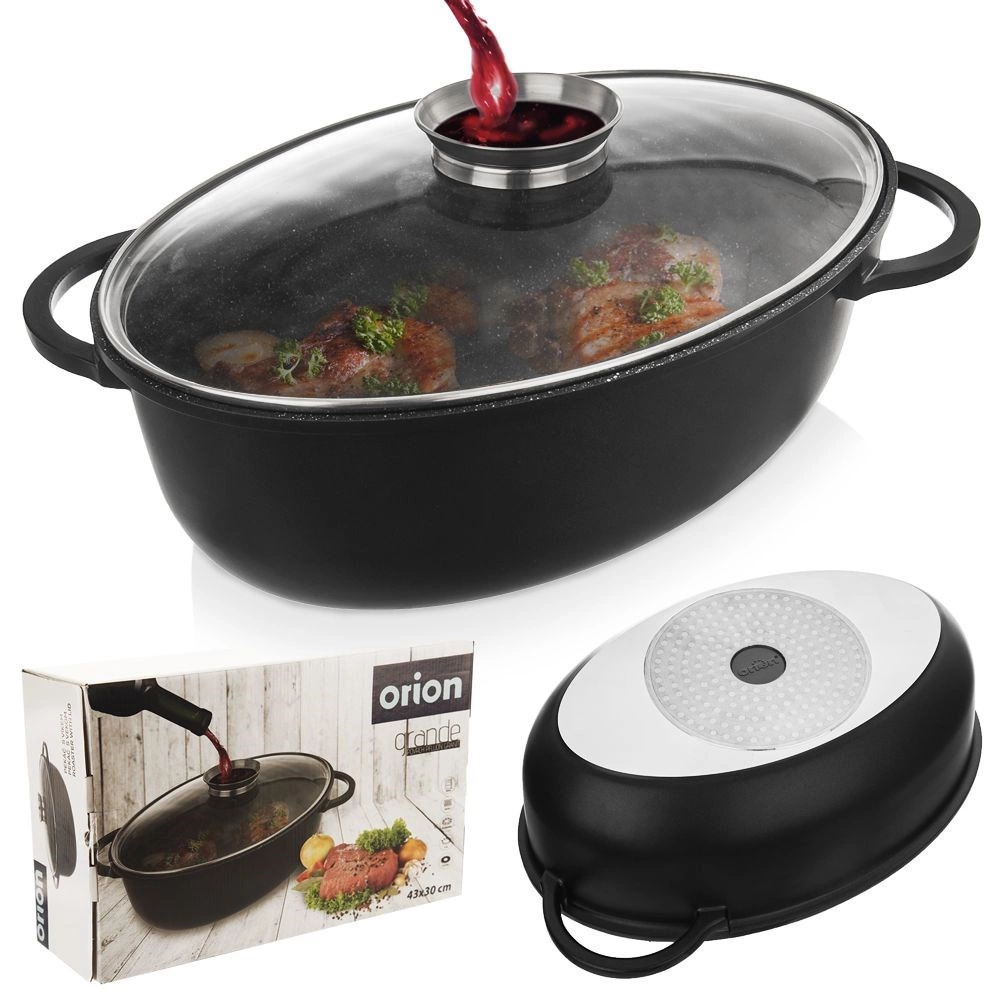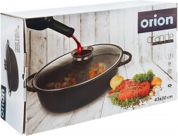 V balení nájdete 1× hlboký oválny pekáč (vonkajšie rozmery 45 × 27,5 × 13 cm, vnútorné 37,5 × 25 × 13 cm, objem 8 l) a 1× sklenené veko (vonkajšie rozmery 39 × 26,5 × 7 cm). ORION – originálny produkt českej značky vyrobený v súlade s európskymi štandardmi.