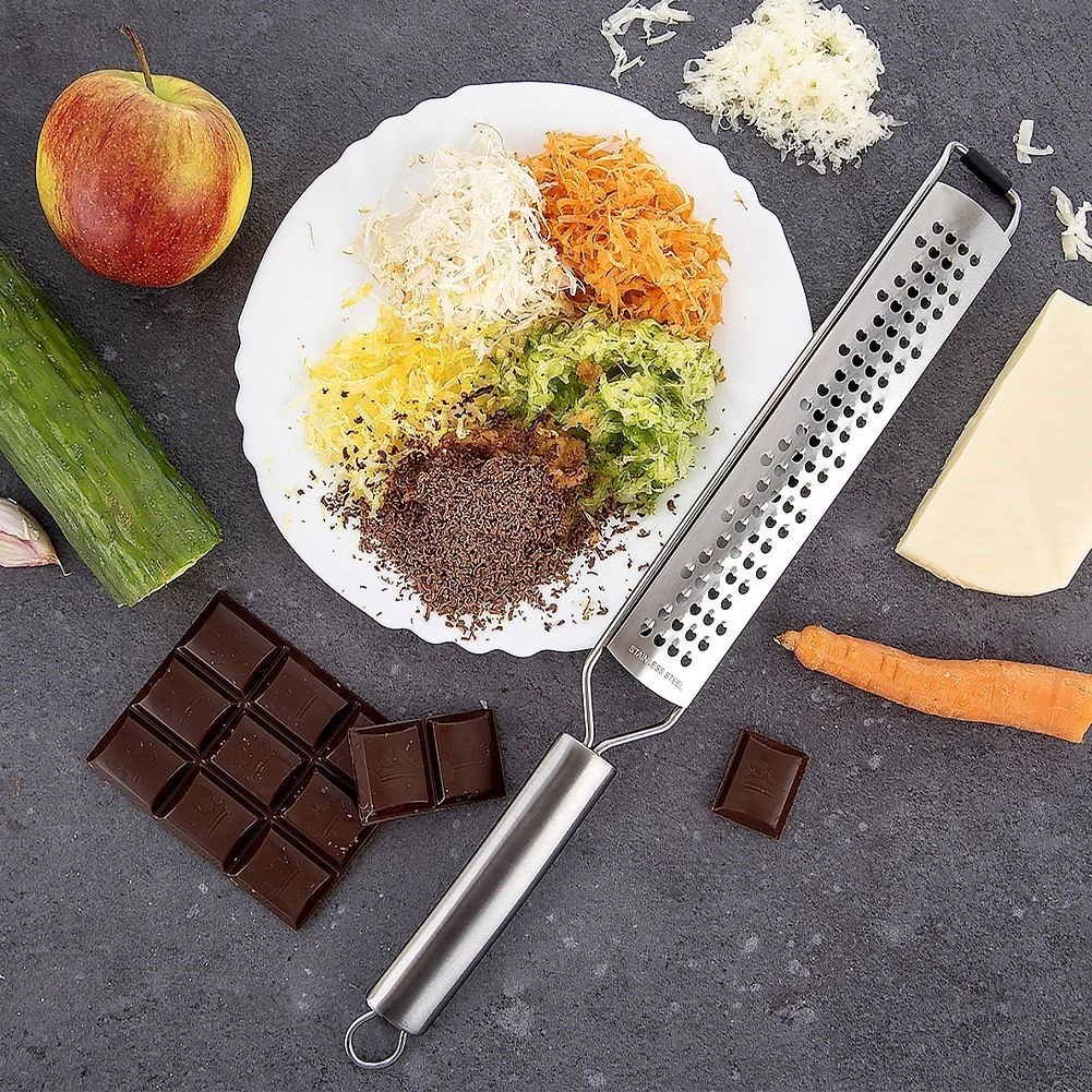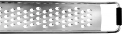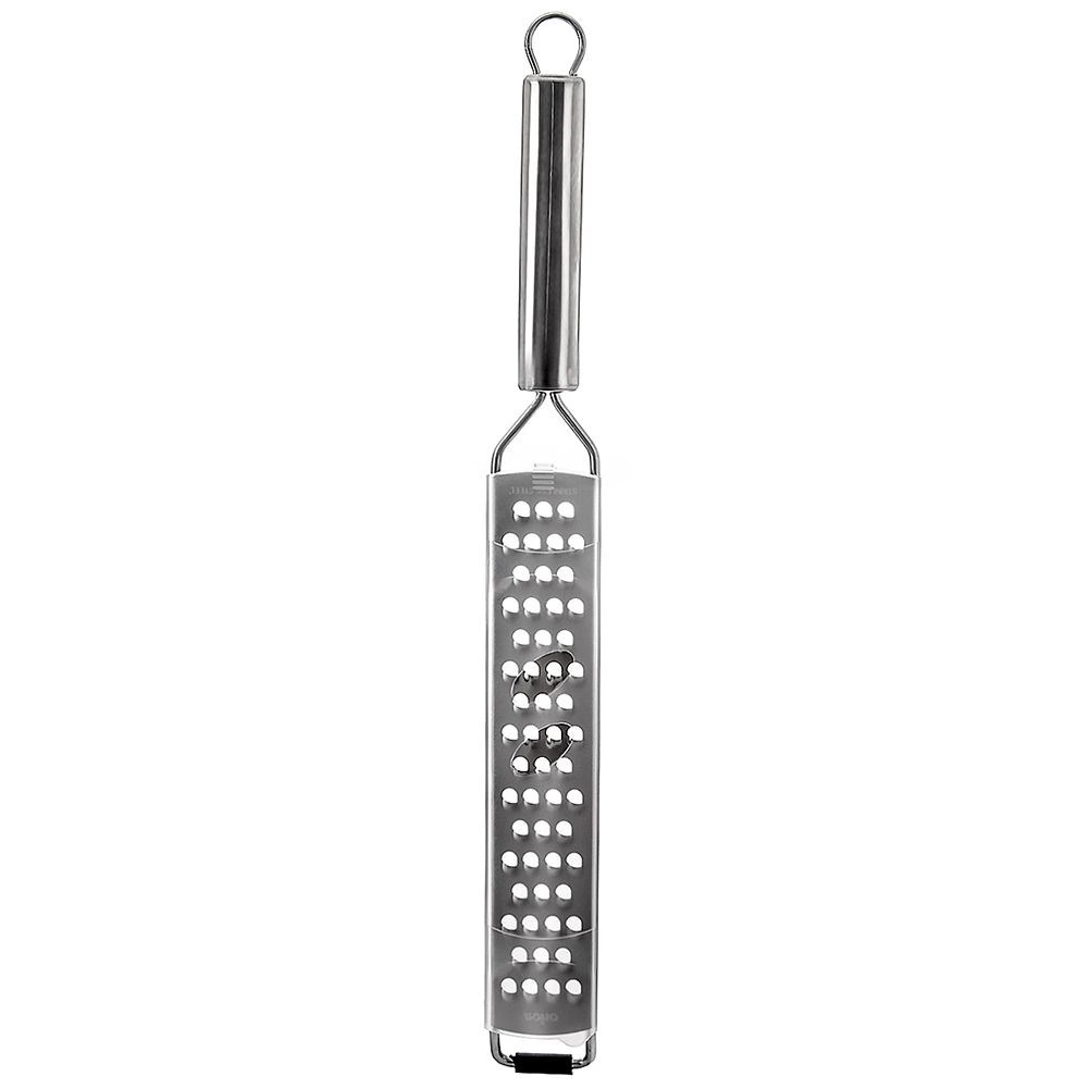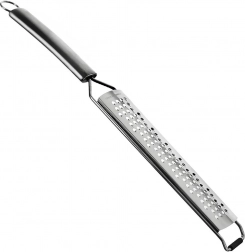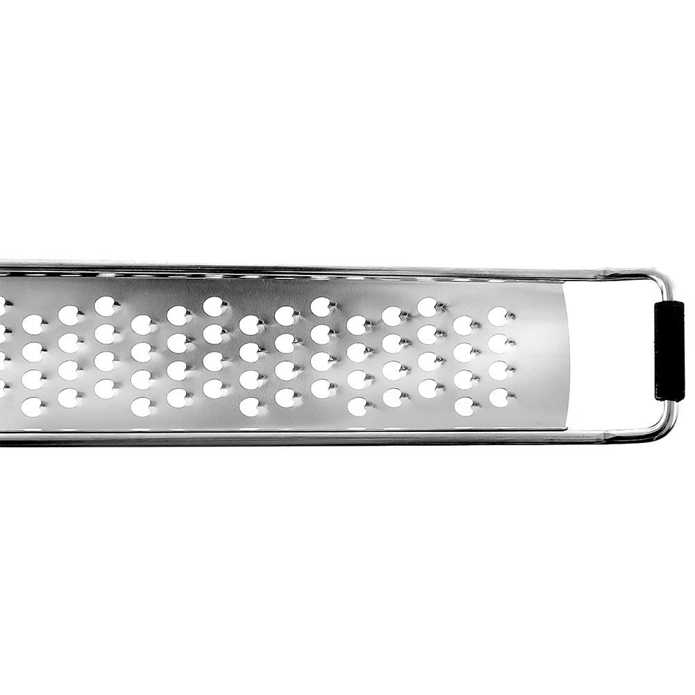 Praktické ploché strúhadlo z nehrdzavejúcej ocele s dĺžkou 38 cm a šírkou 4 cm na rýchle a rovnomerné strúhanie. Vďaka ostrým otvorom ľahko nastrúhate zeleninu, tvrdé syry, cesnak, orechy aj citrusovú kôru. Má dlhú rukoväť s očkom na zavesenie, protišmykovú koncovku pre bezpečné použitie na riade a ochranné puzdro pre bezpečné uloženie. Vhodné do umývačky.