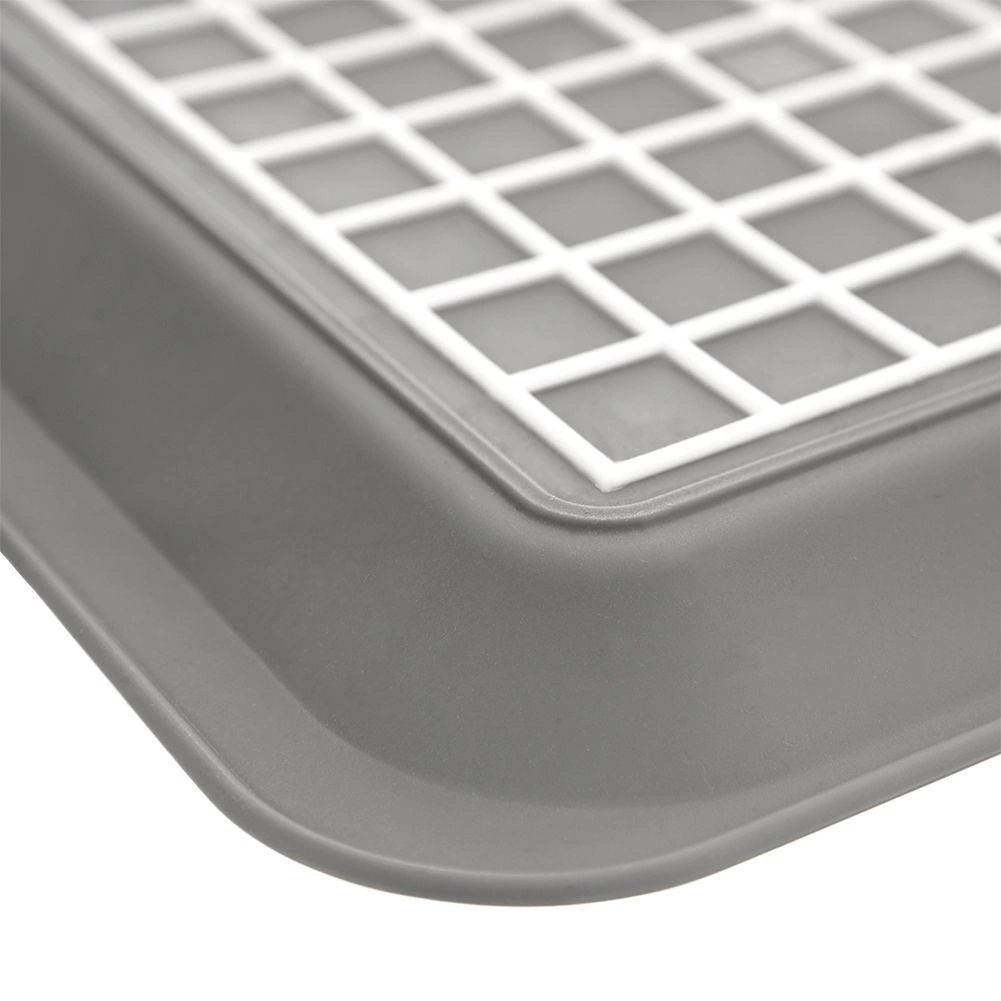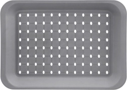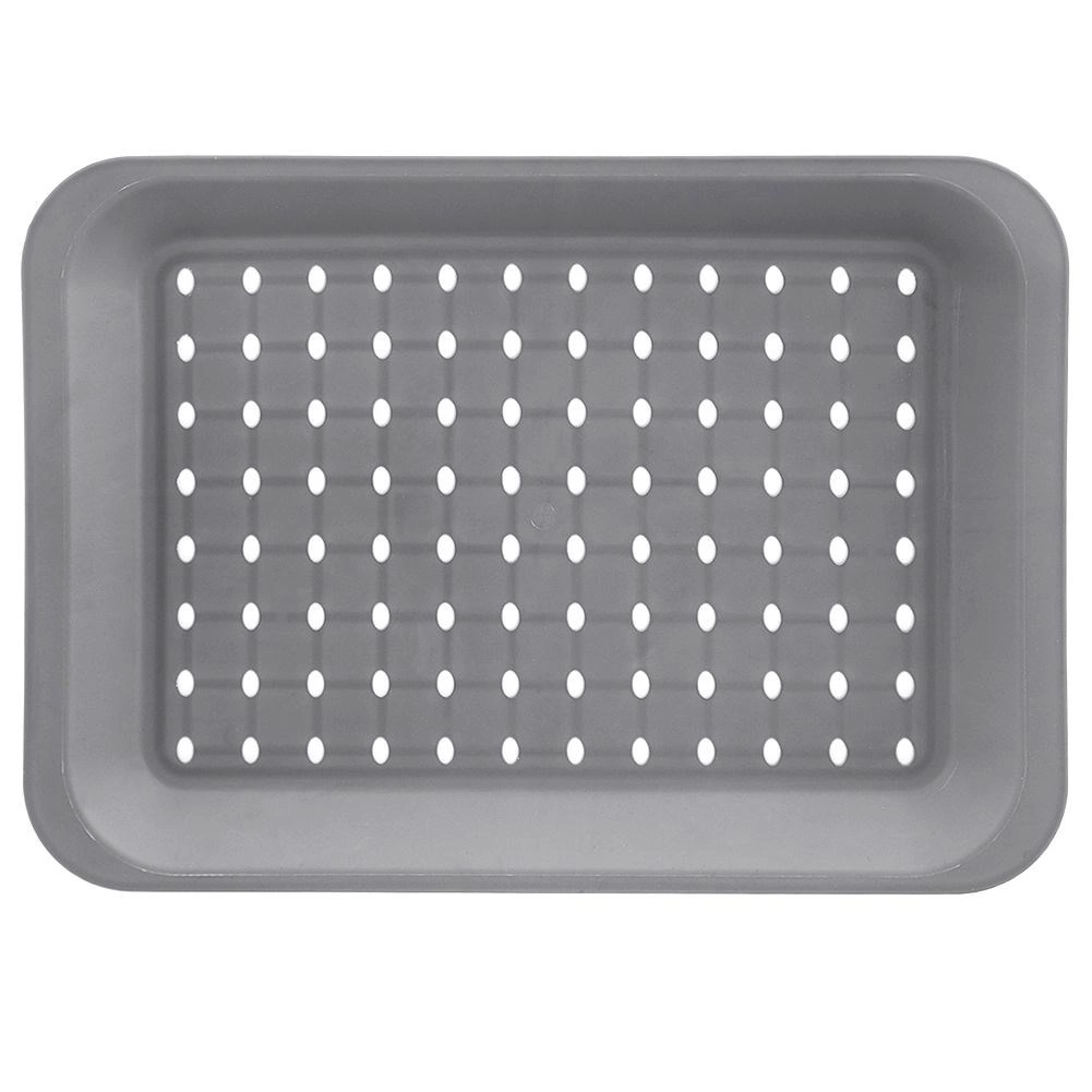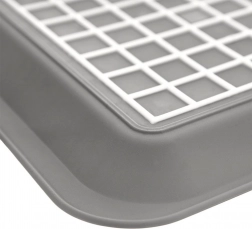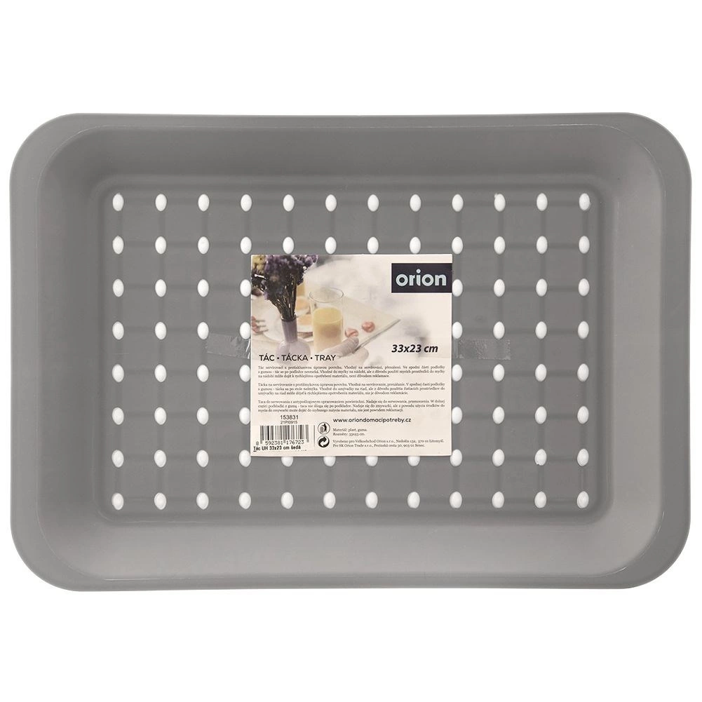 Šedý servírovací táck je spoľahlivým pomocníkom na podávanie nápojov a pokrmov. Odolný plast s bielymi prvkami a protišmykovou úpravou zaručuje stabilitu pri prenášaní, a to ako na hornej ploche, tak aj na spodnej strane. Táck sa vďaka zvýšenému okraju pohodlne drží a minimalizuje riziko rozliatia.