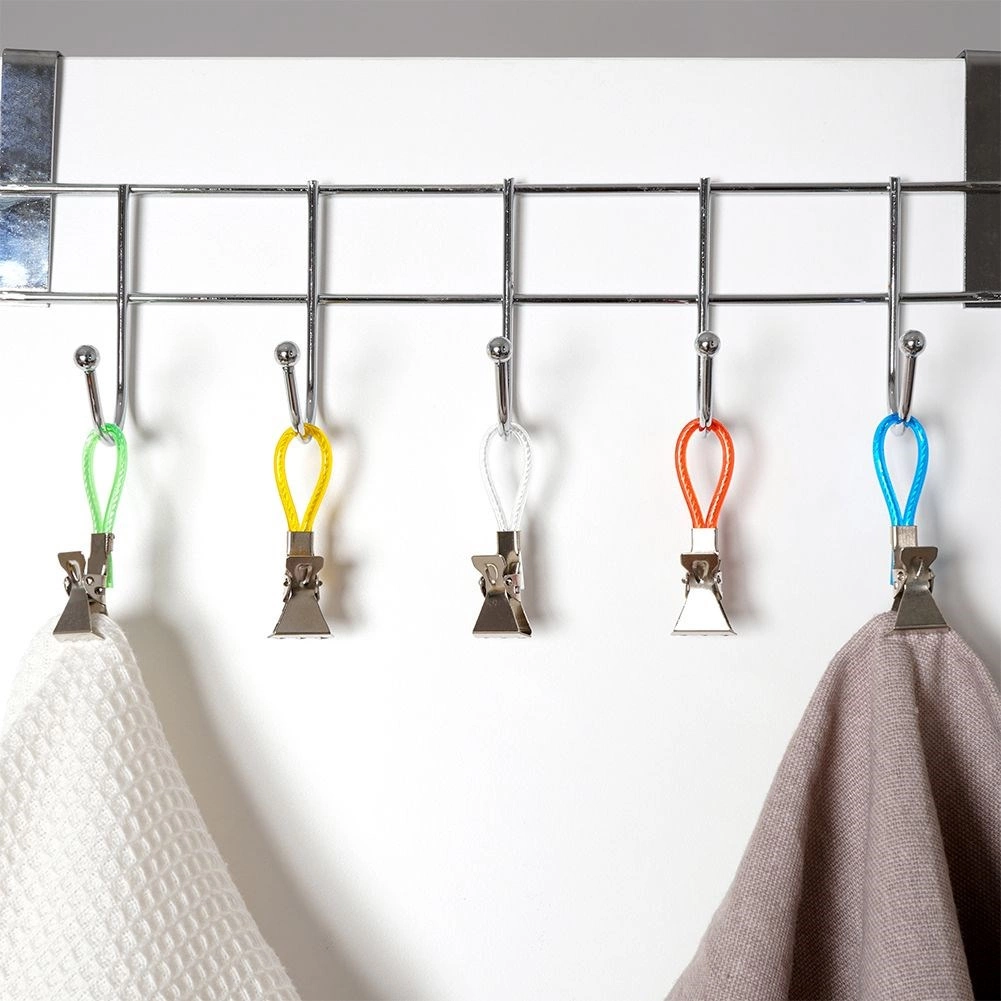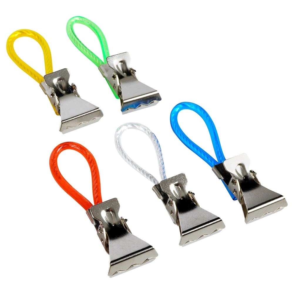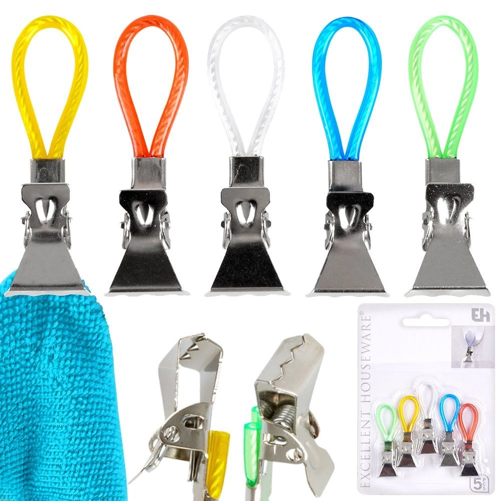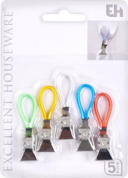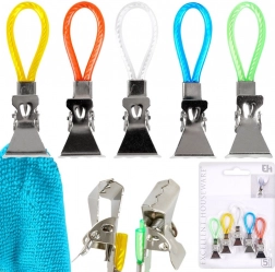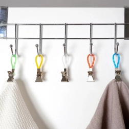 Praktická sada piatich klipov na uteráky a utierky s farebnými očkami pre jednoduché zavesenie. Klipy majú pevné kovové čeľuste, odolné prevedenie a rôznofarebné pútka pre prehľadnú organizáciu. Ideálne do kúpeľne aj kuchyne, držia spoľahlivo a nešmýkajú sa z textílií.