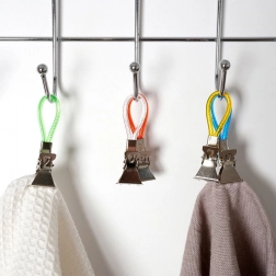 Objavte jednoduchý spôsob, ako udržať uteráky a utierky vždy poruke a úhľadne zavesené. Kovové klipy s farebnými pútkami umožnia rýchle zavesenie na háčik, tyč či vešiak a vďaka zubatým čeľustiam pevne držia aj na hladších tkaninách. Rôzne farby slučiek uľahčia rozlíšenie uterákov pre jednotlivých členov domácnosti.