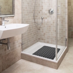 Desiatky prísaviek po celej ploche zabezpečia pevné uchytenie k hladkému povrchu sprchy alebo vane a minimalizujú riziko pošmyknutia.