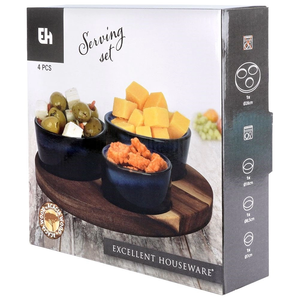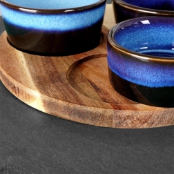 Táto dizajnová sada kombinuje minimalizmus a moderný vzhľad. Tri glazované mištičky v elegantnej modro‑čiernej farebnej gradácii perfektne sedia do vyfrézovaných miest kruhového tácka z akáciového dreva, takže sa pri prenášaní neposúvajú. Skvele sa hodí na dipové omáčky, antipasti, oriešky či malé pochutiny.
