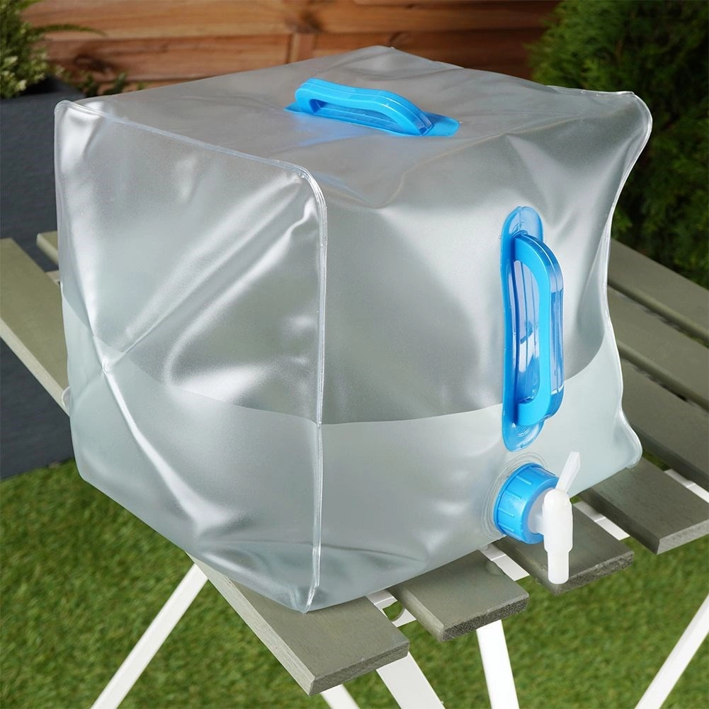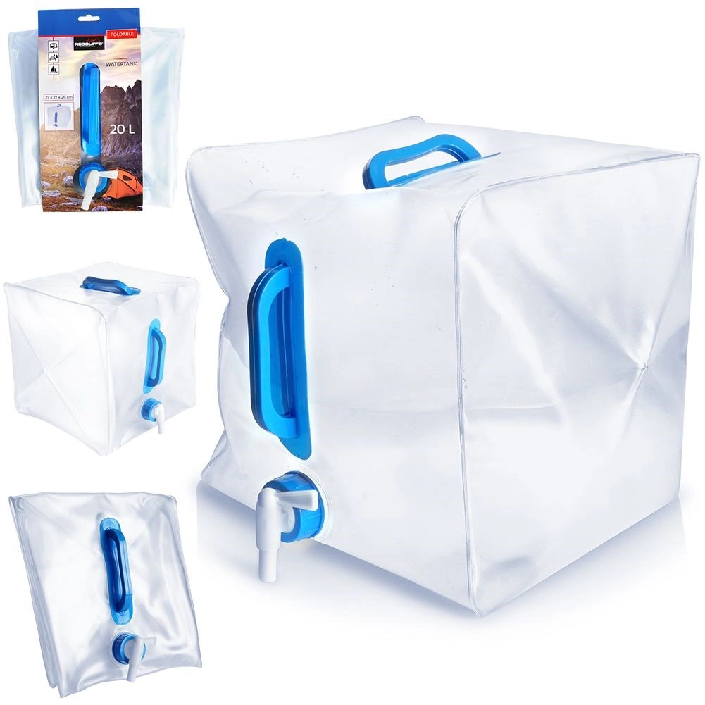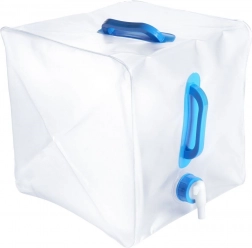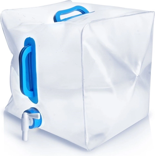 Skladací kanister na pitnú vodu s objemom 20 litrov je vyrobený z kvalitného transparentného plastu, ktorý je odolný a zároveň ľahký. Vstavaný kohútik umožňuje kontrolované nalievanie bez rozlievania a ergonomické madlá uľahčujú prenášanie aj plného zásobníka.