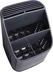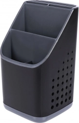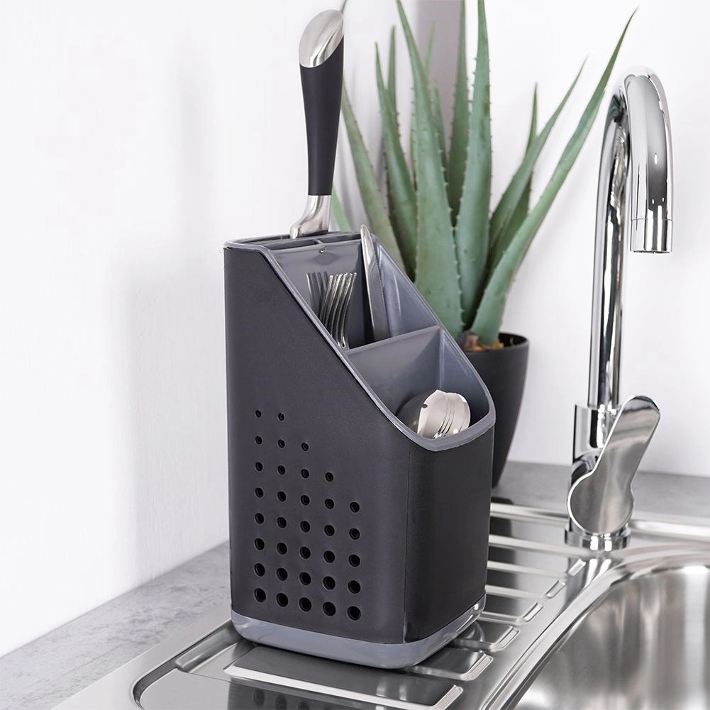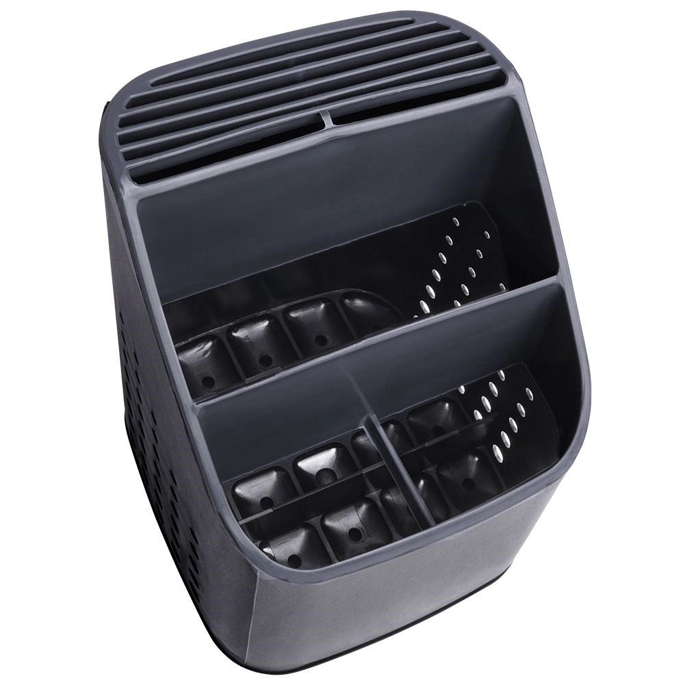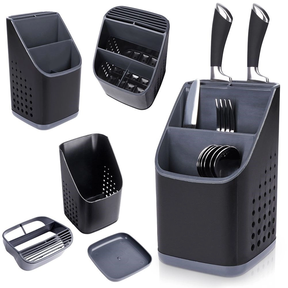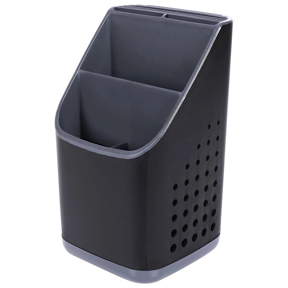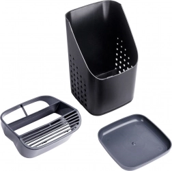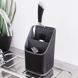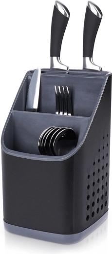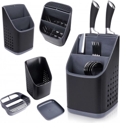 Praktický odkvapkávač a organizér na príbory a kuchynské náradie v elegantnej čiernej farbe s grafitovými prvkami. Vďaka premyslenej konštrukcii s vyberateľným vloženým triedením, horným držiakom na nože a odkvapkávacou miskou udrží vaše kuchynské náradie v suchu a na svojom mieste. Ľahký, odolný a ľahko čistiteľný pomocník pre každú kuchyňu.
