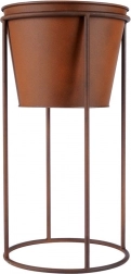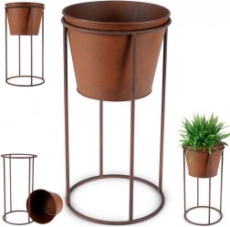 Štýlový kovový kvetináč na vysokom stojane s celkovou výškou 44 cm dodá interiéru aj exteriéru jedinečný nádych. Má rustikálny retro vzhľad, stabilnú kruhovú základňu a kvalitné kovové prevedenie s drsnou textúrou v hrdzavej farbe. Ideálny pre živé aj umelé rastliny a bylinky, skvelo vynikne v obývačke, na balkóne, terase aj v kancelárii.