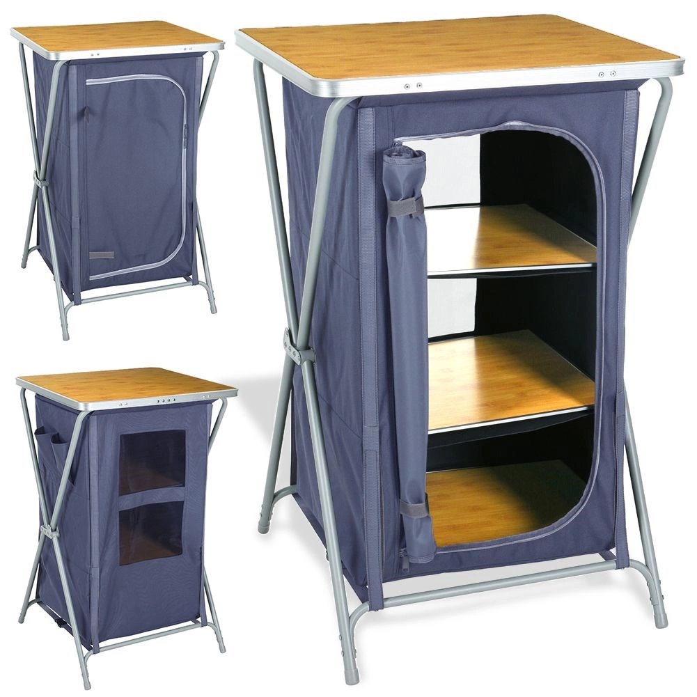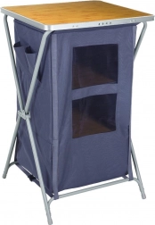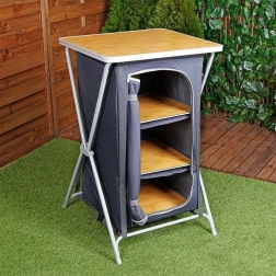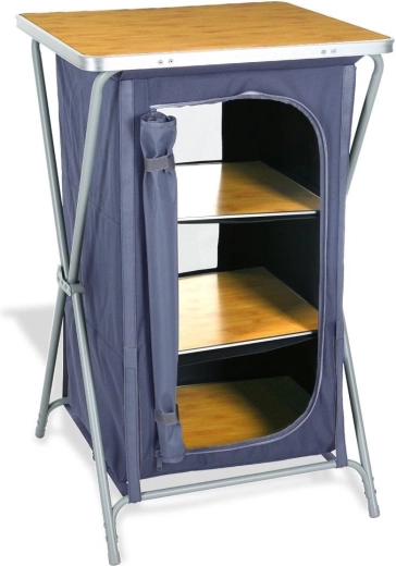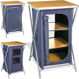 Praktická kempingová skrinka so stabilným oceľovým rámom, odolnou textíliou a MDF doskou v dekore dreva. Ponúka tri priestranné police, rýchle skladanie, zipsové zatváranie a ľahkú prepravu vrátane tašky. Ideálna na kempovanie, karavan aj stan.