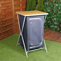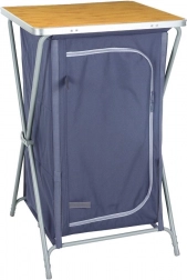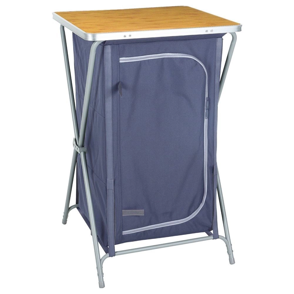 S touto skladacou kempingovou skrinou získate prehľadné a hygienické uloženie vybavenia na cestách. Odolný oceľový rám, kvalitný polyester v tmavosivej farbe a horná doska z MDF s vzhľadom dreva tvoria pevnú a pritom mobilnú kombináciu, ktorú ľahko zbalíte aj rozložíte.