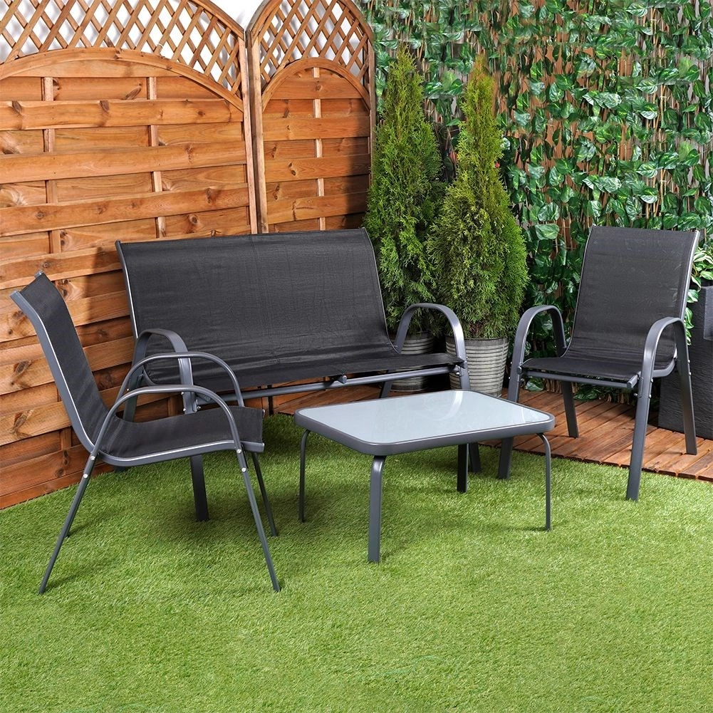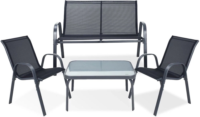 Štýlová sada záhradného nábytku pre 4 osoby obsahuje 2 kreslá, dvojmiestnu lavicu a konferenčný stolík so sklenenou doskou. Odolná kovová konštrukcia v sivej farbe a priedušné textilné výplety z polyesteru zaisťujú dlhú životnosť a pohodlie. Ideálna na terasu, balkón aj záhradu.
