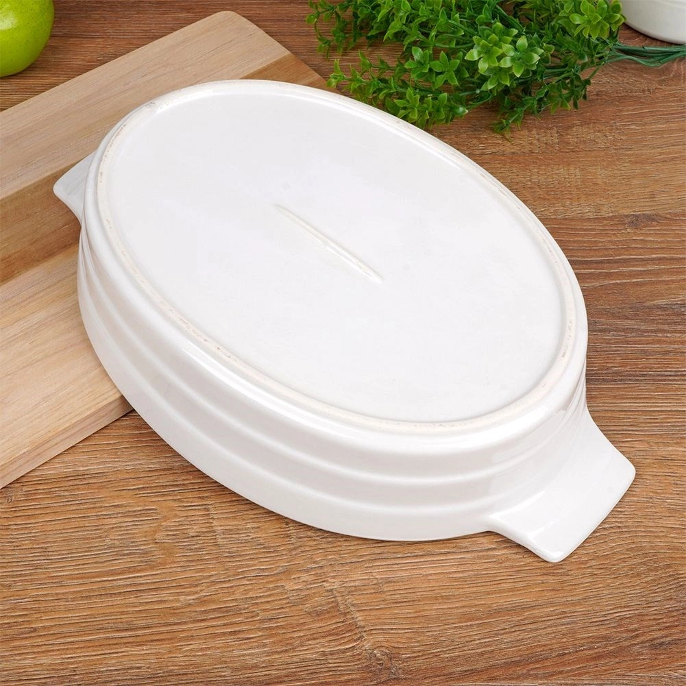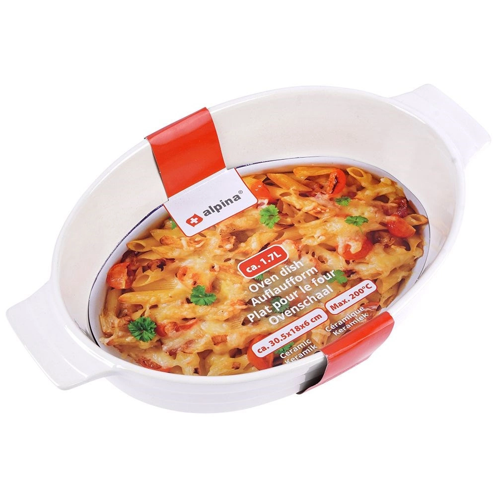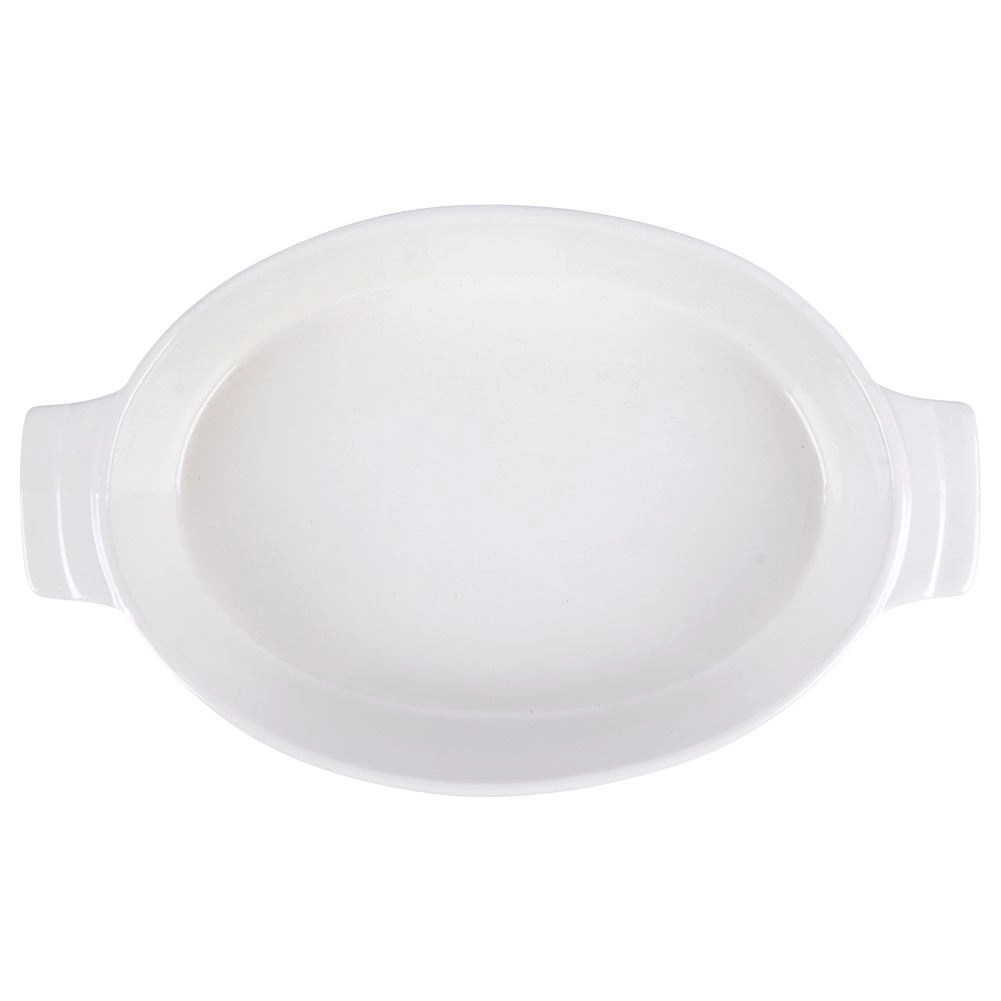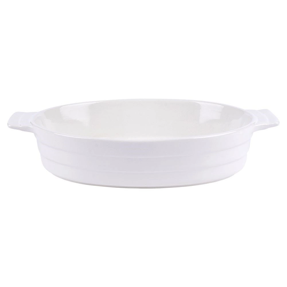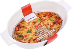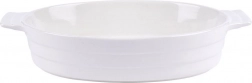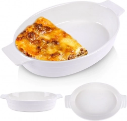 Praktická oválna miska na zapekanie z kvalitnej keramiky v elegantnej bielej farbe. Ideálna na lasagne, zapekané zemiaky aj zeleninu. Má integrované úchyty na bezpečné prenášanie, objem 1,4 l a je vhodná do rúry do 200 °C. Pre jednoduchú údržbu je vhodná do umývačky a skvele sa hodí aj na servírovanie priamo na stôl.