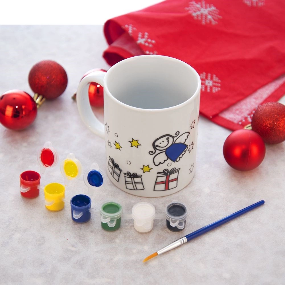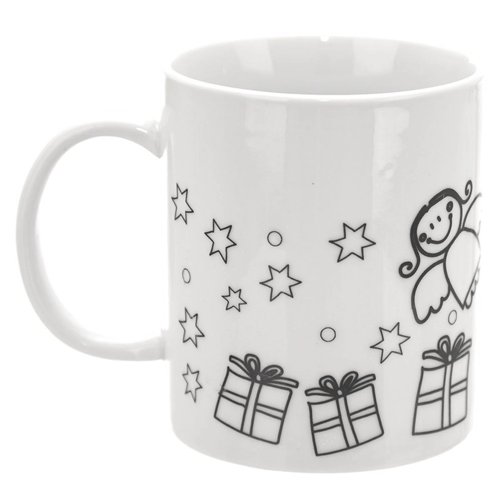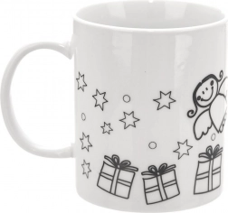 Vytvorte si svoj vlastný vianočný hrnček! Tento porcelánový hrnček na vymaľovanie s objemom 350 ml má predtlačené obrysy stromčeka, darčekov, hviezdičiek a anjelika a v balení nájdete štetec a 6 akrylových farieb. Hrnček je vhodný do umývačky aj mikrovlnky a po vypálení v rúre si dlho zachová žiarivé farby.