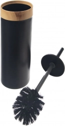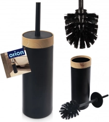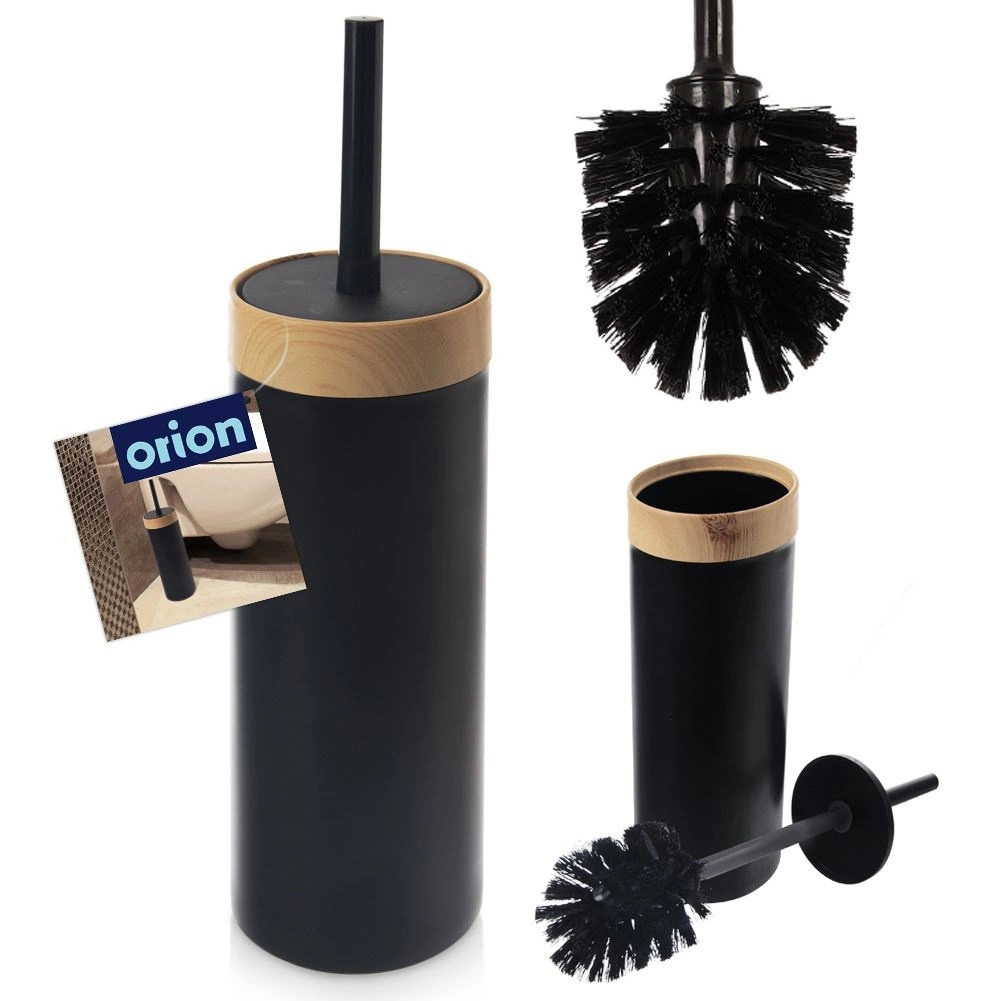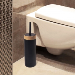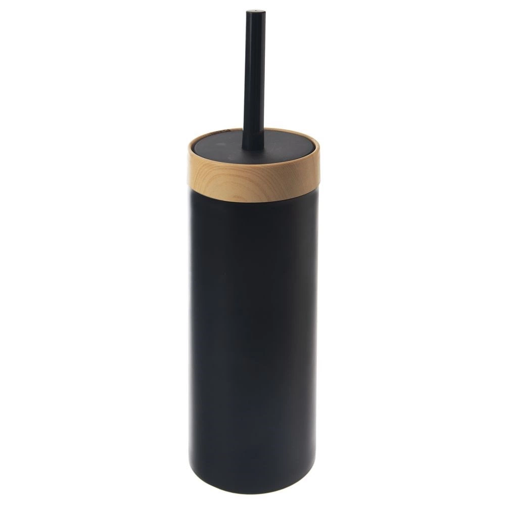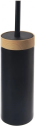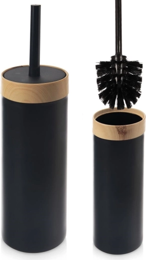 Elegantná toaletná kefa so stojanom v čiernej farbe s krytom a odkvapkávačom pre hygienické používanie. Vyrobená z odolného plastu s povrchovou úpravou imitujúcou drevo. , praktická a ľahko udržiavateľná pomôcka do každej kúpeľne či WC.