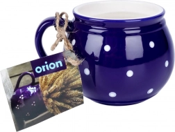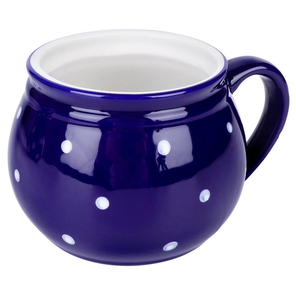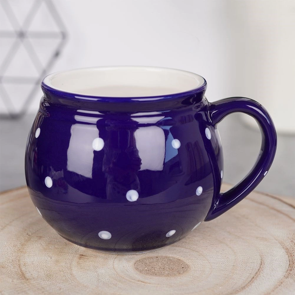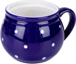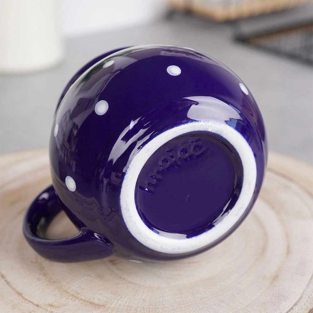 Štýlový keramický hrnček s uchom s objemom 200 ml v tmavomodrej farbe s bielymi bodkami je ideálny na kávu, čaj, kakao aj varené víno. Má pohodlné ergonomické ucho, klasický nadčasový dizajn a vďaka kvalitnej keramike je odolný a bezpečný na styk s potravinami.
