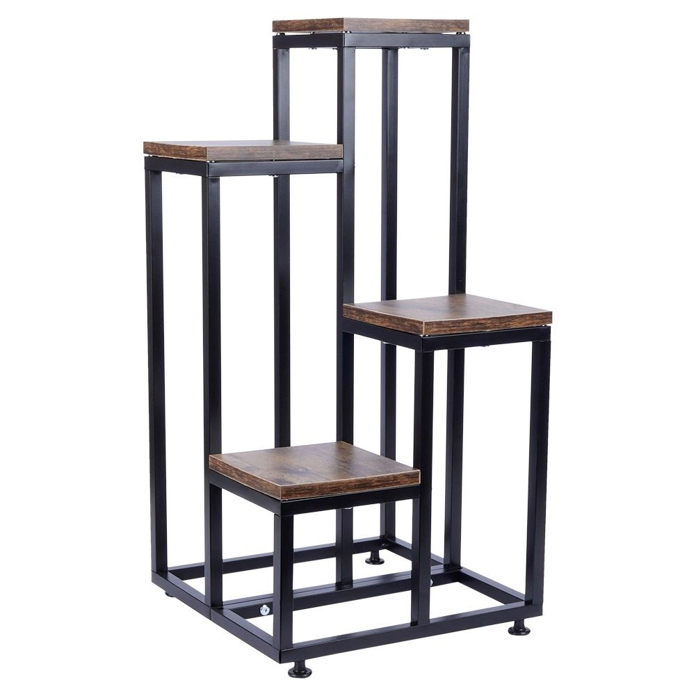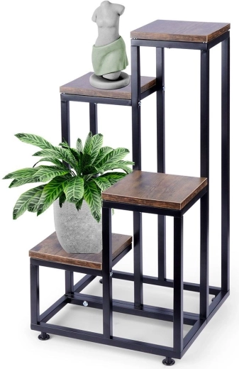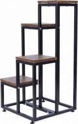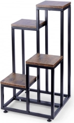 Štýlový kvetinový stojan so štyrmi policami v industriálnom loft štýle. Kombinácia čierneho kovu a MDF v dekore tmavého dreva unesie až 50 kg, je stabilný, odolný a vhodný do interiéru aj na balkón či terasu. Vďaka štyrom úrovniam vytvoríte efektnú kompozíciu rastlín a dekorácií a dodáte priestoru výnimočný charakter.